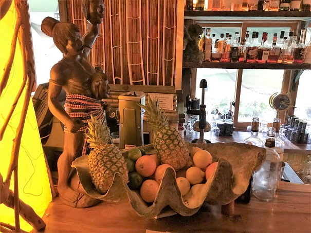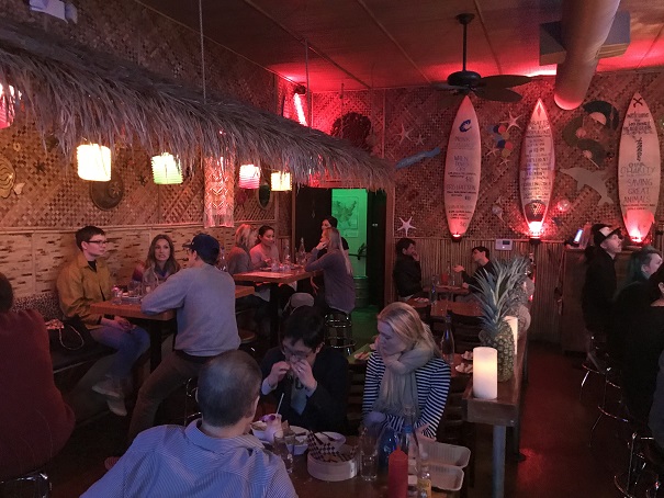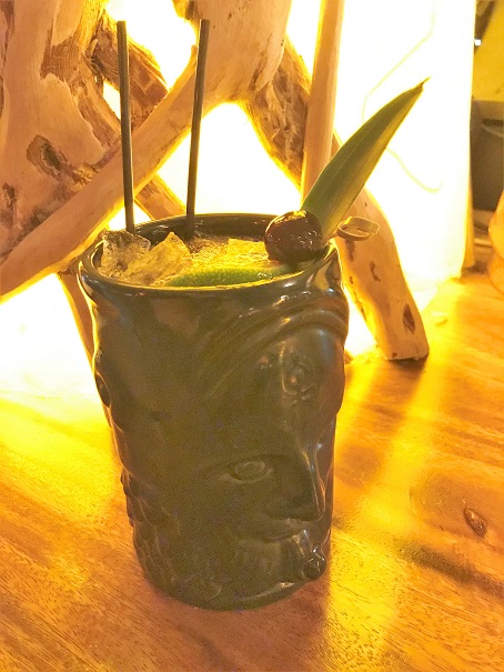 This is more of a restaurant than a tiki bar….but it has a lot of the usual tiki trappings, so… I had to go. (This is a place I had also found via Critiki.) The place lives up to its name. The “No Bones” in its moniker refers to the fact it is a vegan restaurant with all dishes –from the “crab cakes” to the “fish and chips” and “buffalo wings”– are all vegan, made with tofu and other vegetarian substitutes. Drink-wise, I did have a coconut mojito. I also opted to try the “Coastal Chowder”, which cleverly used oyster mushrooms instead of clams.