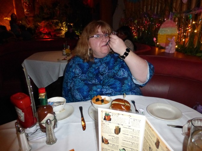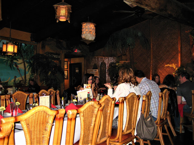 We started off with drinks in the bar. Fortunately we got there early enough to score a booth for the four of us. I was quickly enamored with the place. The liberal use of bamboo, palm frond thatch and coconut logs made me really feel as if I were on the set of some wild “Gilligan’s Island” reboot. It was loud and fun and the drinks were ginormous.