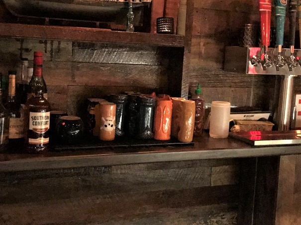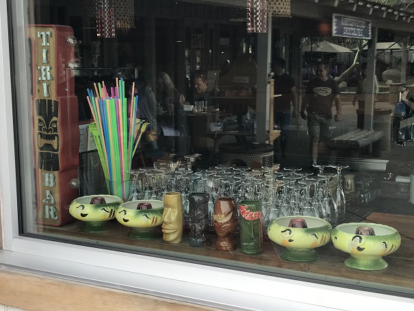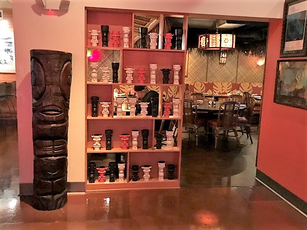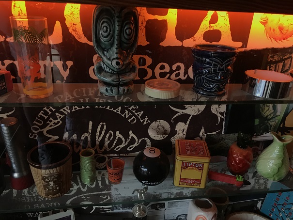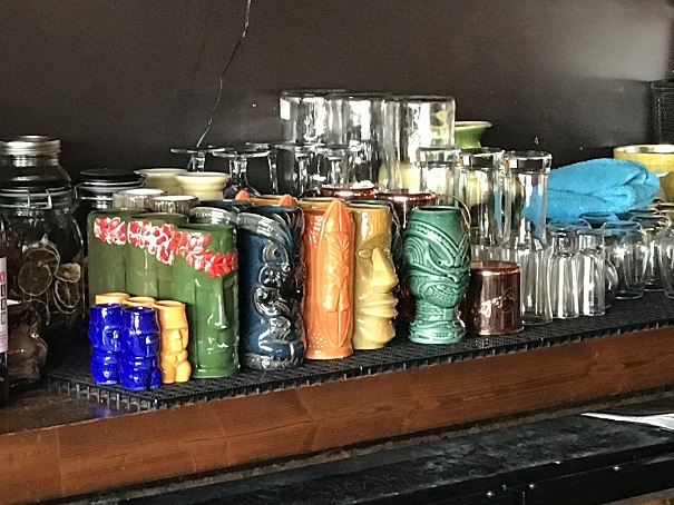 On one narrow shelf there a collection of tiki mugs. Some are from other places and some–like the one that looks like a crazed zombie in a chef’s hat–are created by the bar’s owner for special occasions and that they sell.
