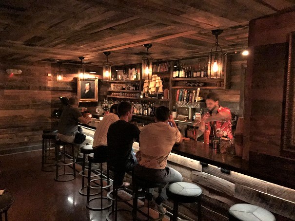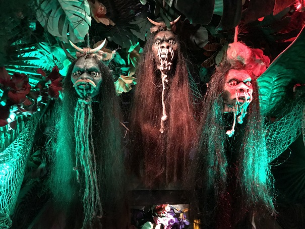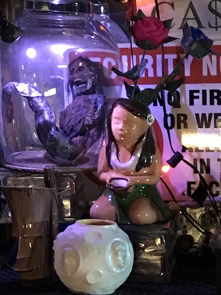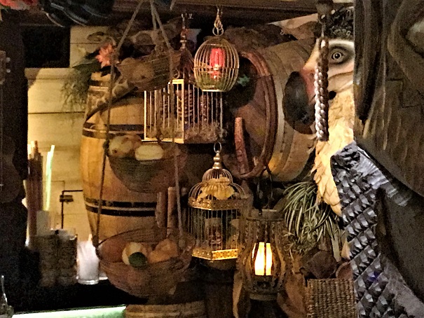 I had heard that reservations are recommended, but it was a Monday night. We didn’t expect a crowd. Indeed, the “crowd” up in the garage was kind of sparse. However, when we made our was down the vine and shrunken head-covered stairway to the bar’s entry, we were, in fact, asked if we had reservations. No, we didn’t. It was a busy night–but fortunately not that busy. We were told we would have to wait. But the wait was not that long.