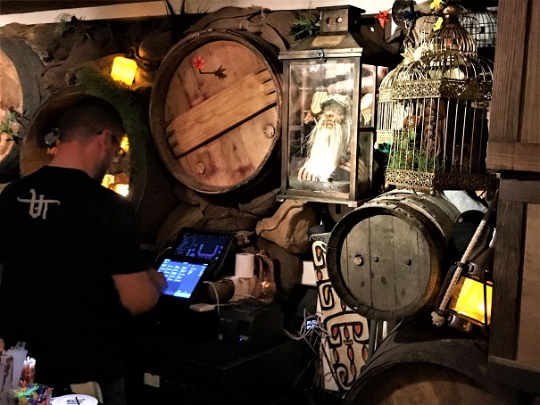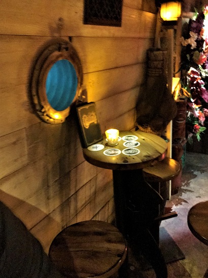 The theme of the bar is that you are supposed to be in the hull of an old, 18th century clipper ship as it makes its way along a wild and uncharted coastline. In a bit of imaginative theming, there are portholes along the walls. If you look out through them, you don’t see just some stagnant image. Instead, you can look out as the ship sails along the coastline. You start off at a dock (complete with flickering torches), then set sail. There is a storm with rain, lightning and thunder, and then you are attacked by natives (with arrows flying at you and sticking into the hull around the window). It’s quite a cool feature.