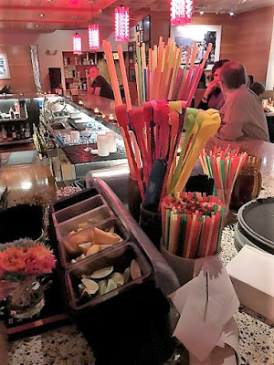 The only true kitsch was tucked away, literally, in display cabinets below the bar, where your legs usually hang out. Ha! You can barely see the colored display here below the bar.  There was some cool stuff in there. Too bad no one will ever see it.