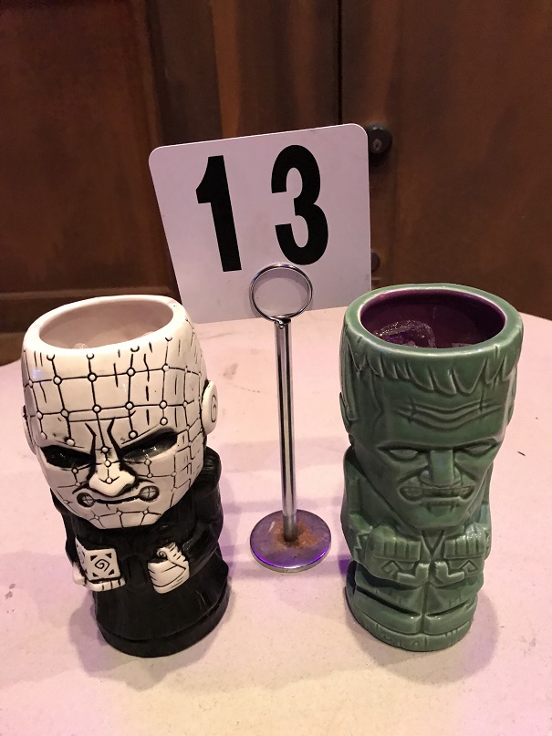 I decided to go with the HELLRAISER Pinhead mug. Nedra went classic with a FRANKENSTEIN’s monster mug. We ordered some burgers to go with our drinks and our table number was, appropriately enough, 13.