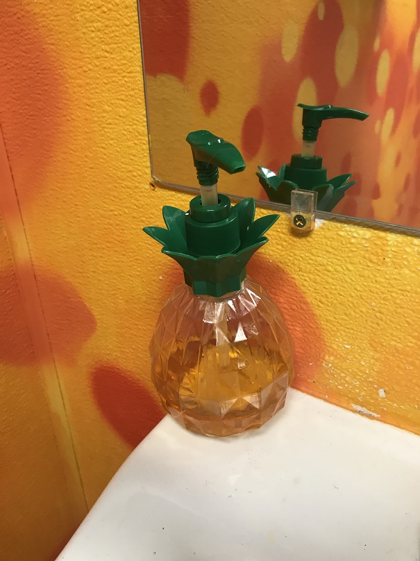 At one point, I visited the bathroom. Zowie! The paint job in there turned the place into a virtual tropical poo-adise. The pineapple-shaped soap dispenser was a nice touch, I think.