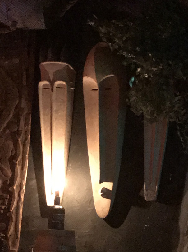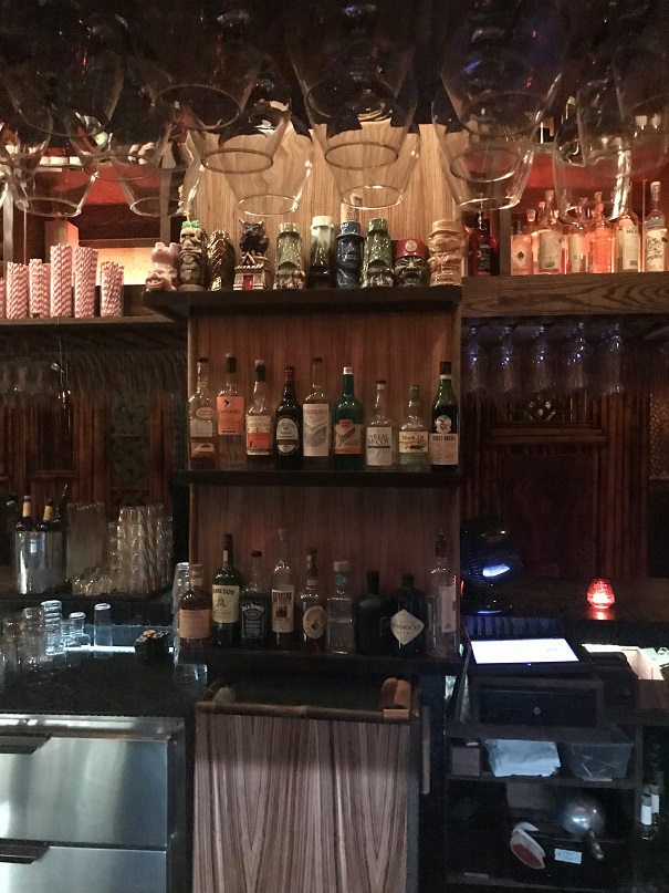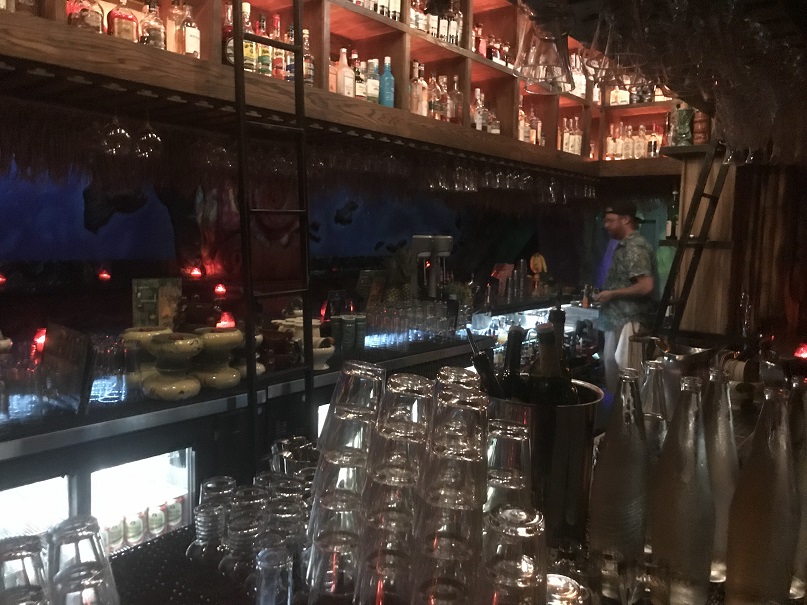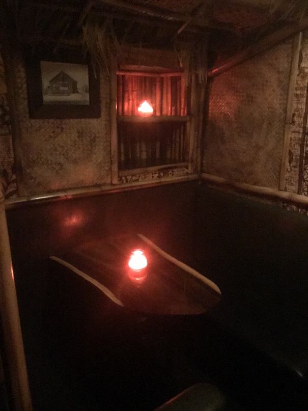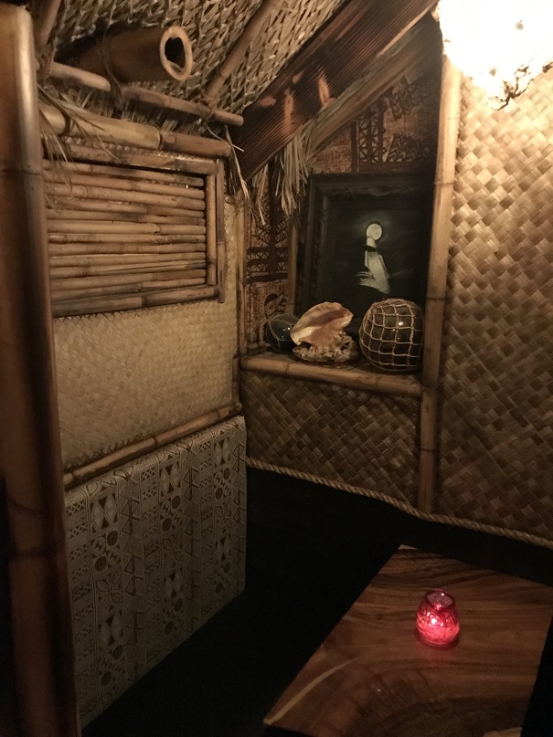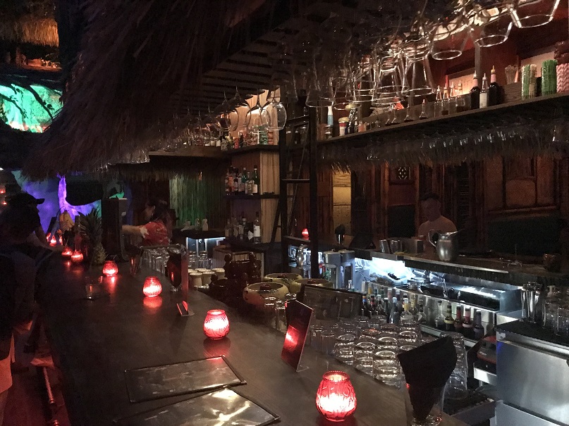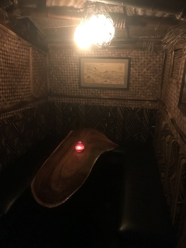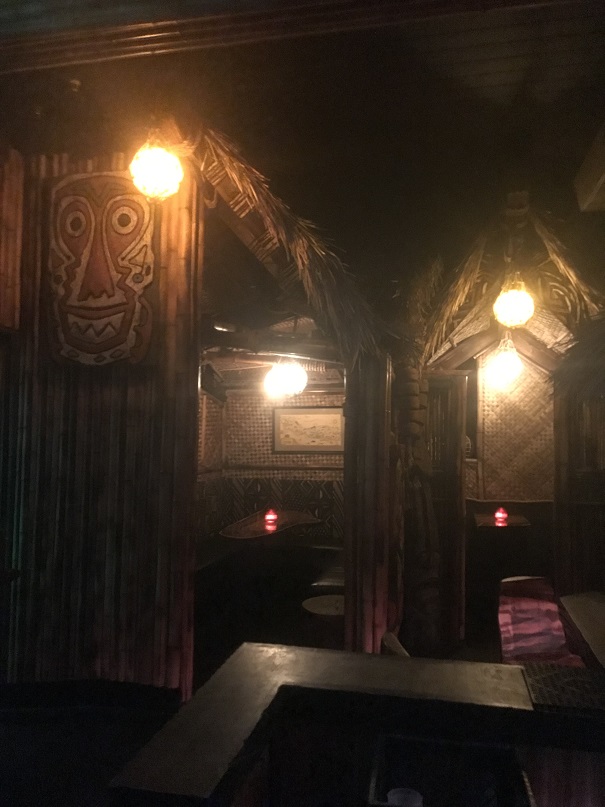 The bartender who was helping me was a friendly guy. He guided me to the other side of the bar where there was seating (on some uniquely carved “bar stools”). I asked if he minded if I took some photos. He said I was free to. So, while I nursed my drink I snapped some shots from my seat. There was a row of tiki “huts” for more cozy seating behind the bar. Very cool.