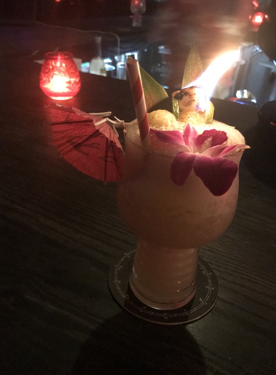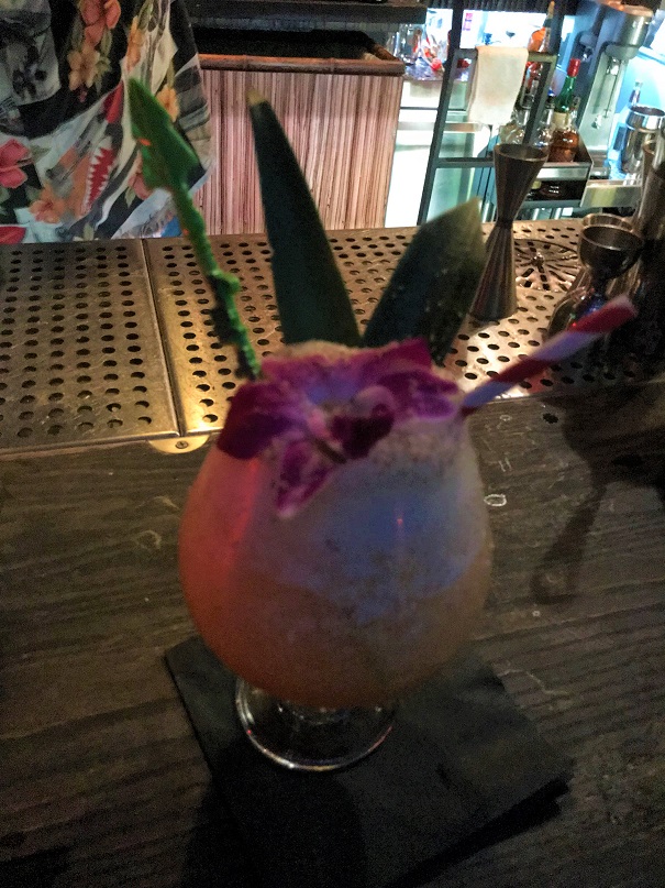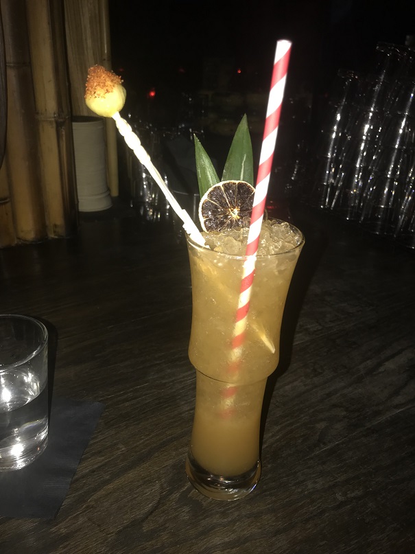The Jamaican Zombie came complete with a pineapple ball covered in spice on the end of a Zombie Village swizzle stick (which instantly went into my pocket. Tiki tourists like me love their silly souvenirs, after all). The was very tasty, too.