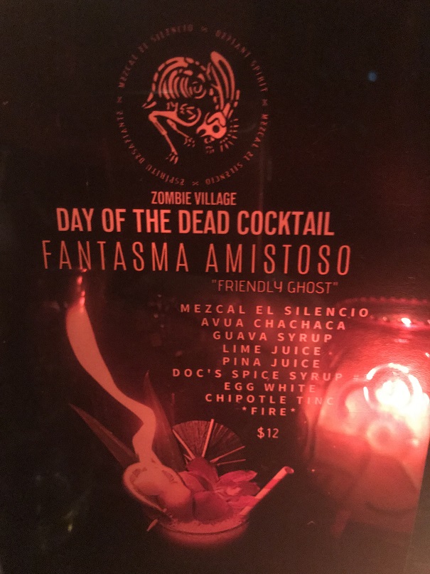 Of course, before I was ready to go, I spotted a flyer for a special Day of the Dead cocktail they had called Fantasma Amistoso. Among its ingredients was…FIRE! Yowza! How could I miss that? Day of the Dead had already come and gone, but several of the flyers were still sitting out. Was it still available? Hmm…