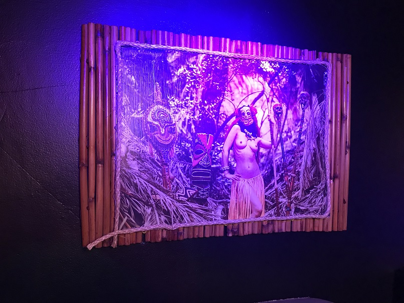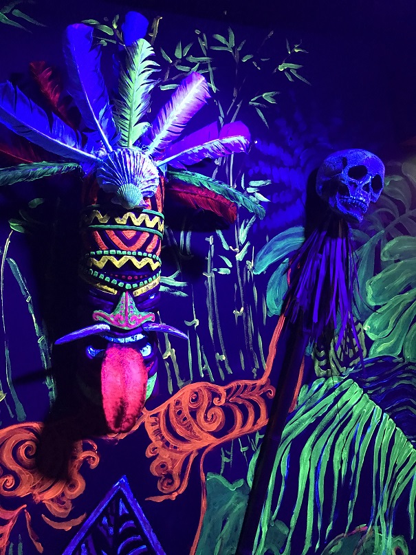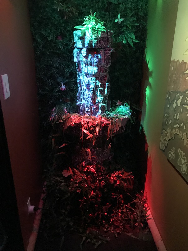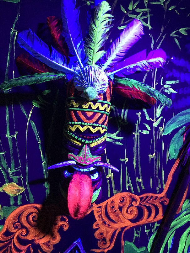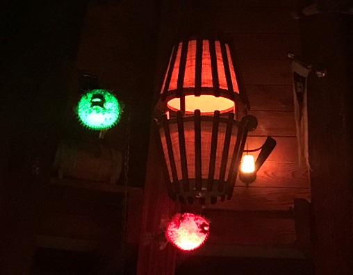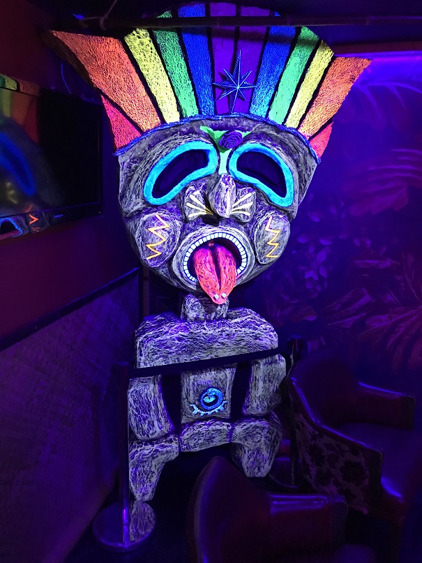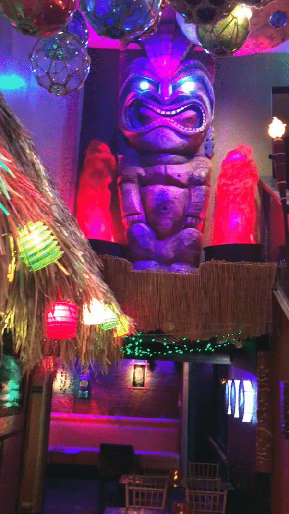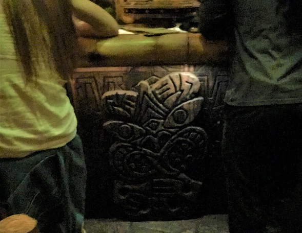 We were given a small wooden tiki and told to place it on a barrel near the entrance. There was some sort of electric eye in the barrel that could read something on the bottom of the tiki. The door unlocked and—wow! We found ourselves walking into a tiki wonderland.