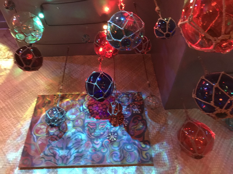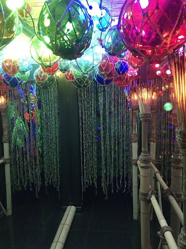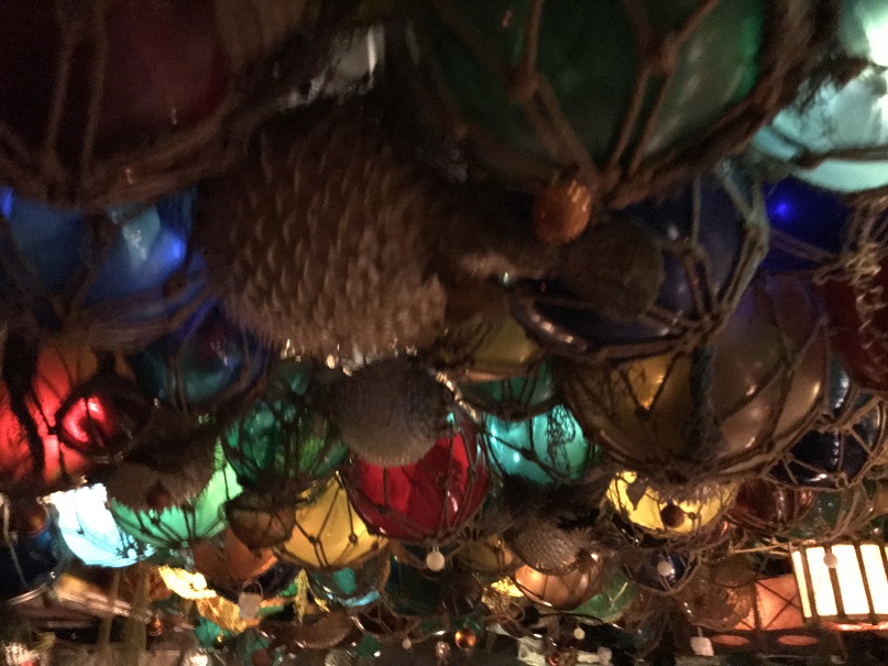 The ceiling was an ocean of colorful glass floats.