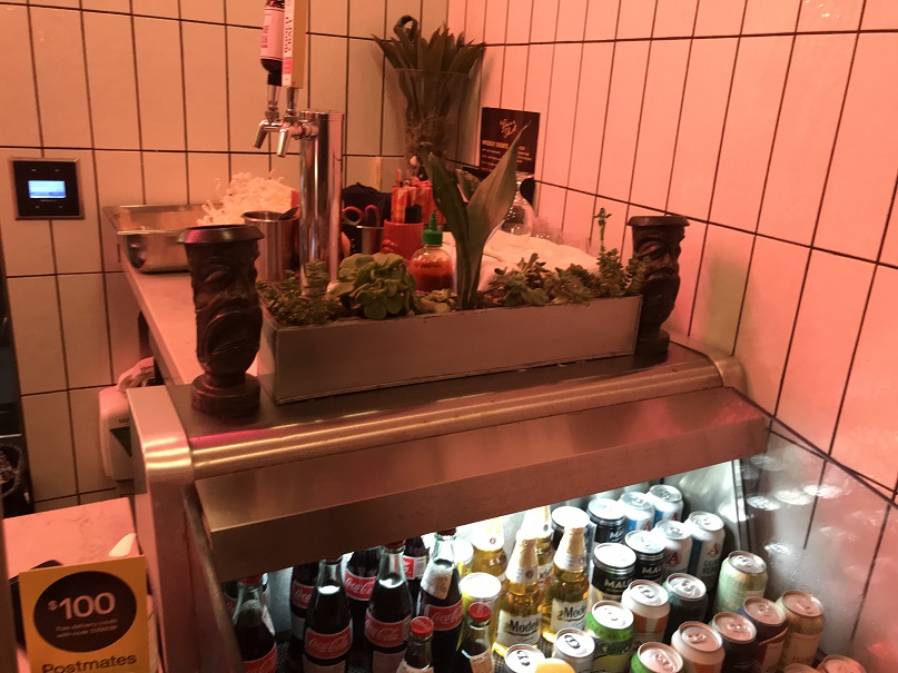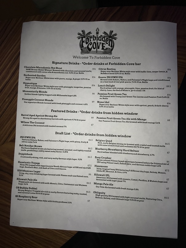 Forbidden Cove was running behind in opening, so we sat at the bar and tried a beer. I wasn’t in a beer mood and wanted to save my alcoholic intake for the tiki cocktails. But, hello? The cocktails are beer and/or seltzer based. What did it matter?