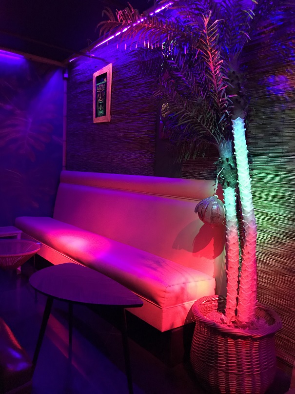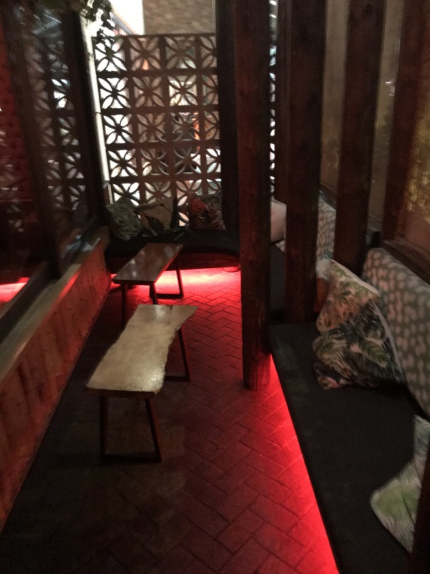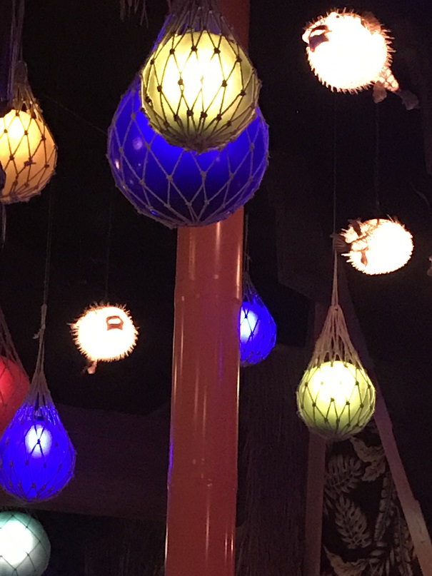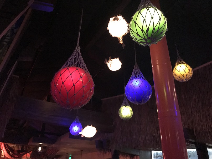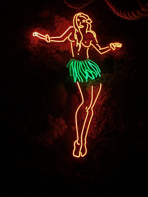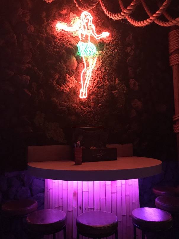 There were so many cool details inside. One seating area had a neon hula dancer (Wearing the namesake ‘grass skirt’?) over it.
