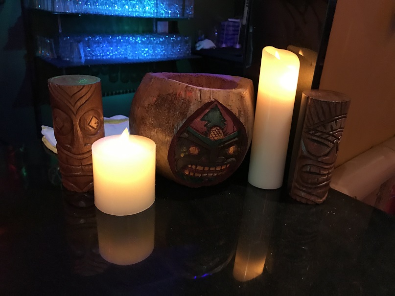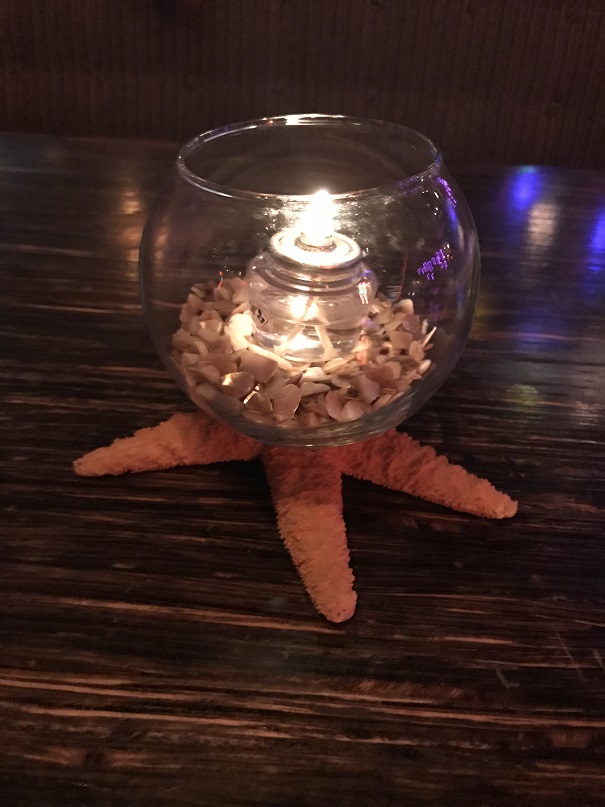 There was a tiki mug on the table with napkins, straws and chopstix in it. Our table candle had a beach-y feel as well.