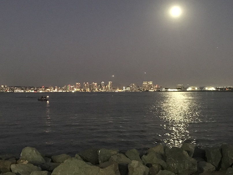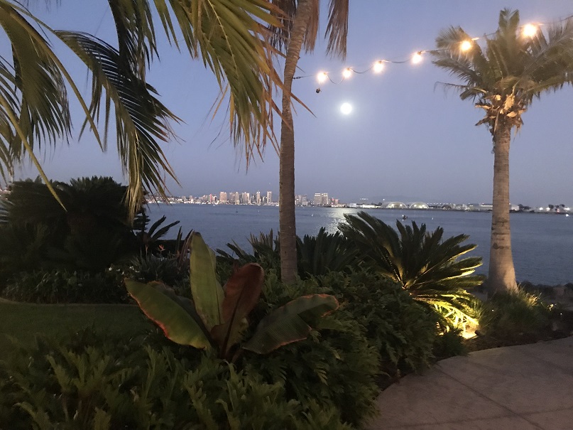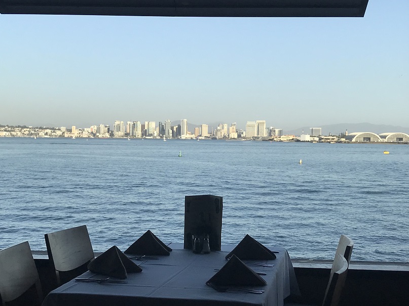 The building is a fun, old, two-story round building with dining on the top floor. It sits on the north point of Shelter Island and features dynamic views of San Diego Harbor and downtown San Diego in the distance.