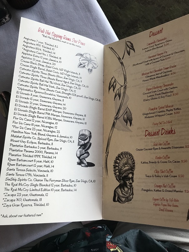 I had to have one of Bali Hai’s World Famous Mai Tais, of course. There have been more than 2.5 million of them sold. In fact, there is a little counter on the Bali Hai website that changes every time one is ordered. How was it? Well, I can say I’ve had one. It was strong, but not exactly a drink I’d order again.