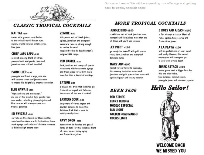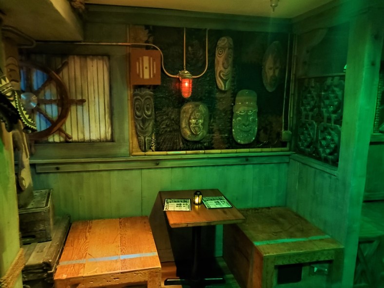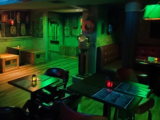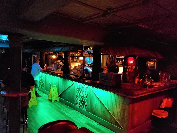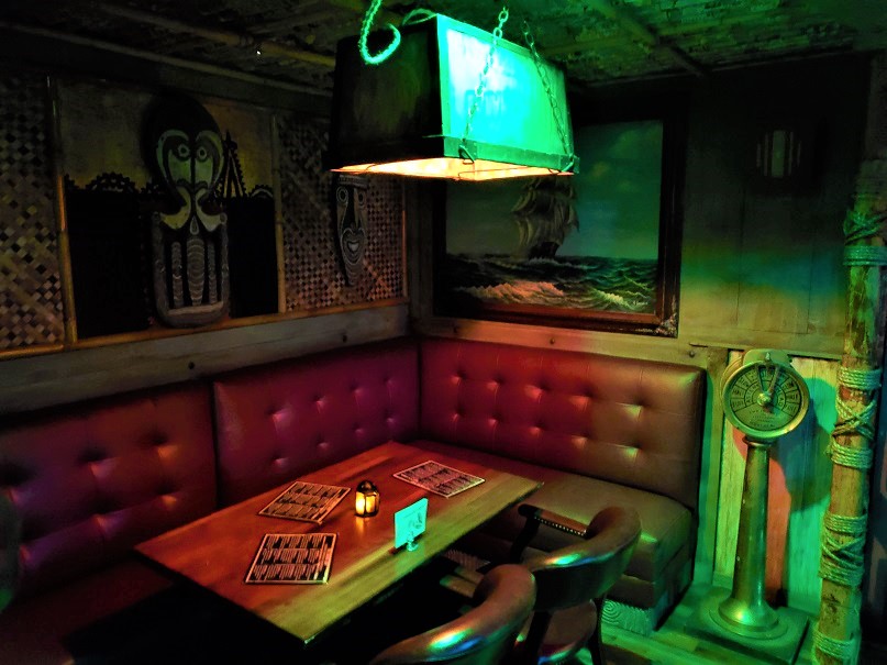 The usual tiki bar kitschy decor is on the lighter side here—but that fits with the nautical theme. Even though there are still the classic touches, like a thatched roof over the bar, colored lighting, and vintage exotica playing over the sound system, it is clear that the Sinking Ship is trying to differentiate itself from Tiki-Ko upstairs.