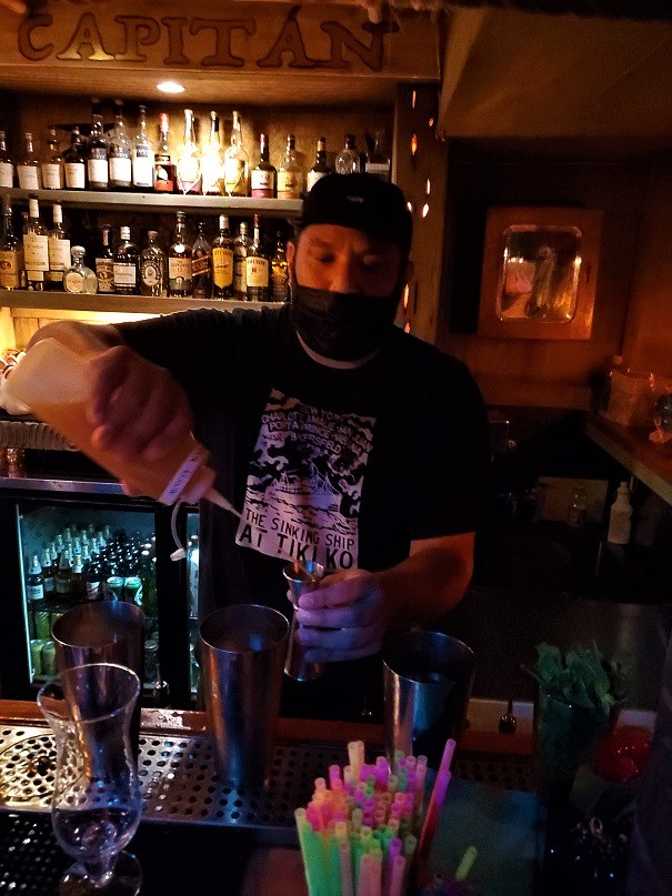 Due to COVID, the staff was all wearing face masks. I looked to see who was working the bar. I recognized Bernard (because of his hair, glasses and thin frame) from Tiki-Ko. The guy next to him was new to me. He goes by the name of Spongie (really Jorge). There was another fellow busy in the corner of the bar. His mask didn’t afford me a good look at his face either. I had hoped that a bartender named Benny, who had been my welcome wagon the first time I set foot in Tiki-Ko back in 2017, would be working that day. Benny had been marvelous. He had been such a tremendous reason the bar had made such an indelible impression on me. However, in his black T-shirt and black mask, this third bartender just didn’t look like him.