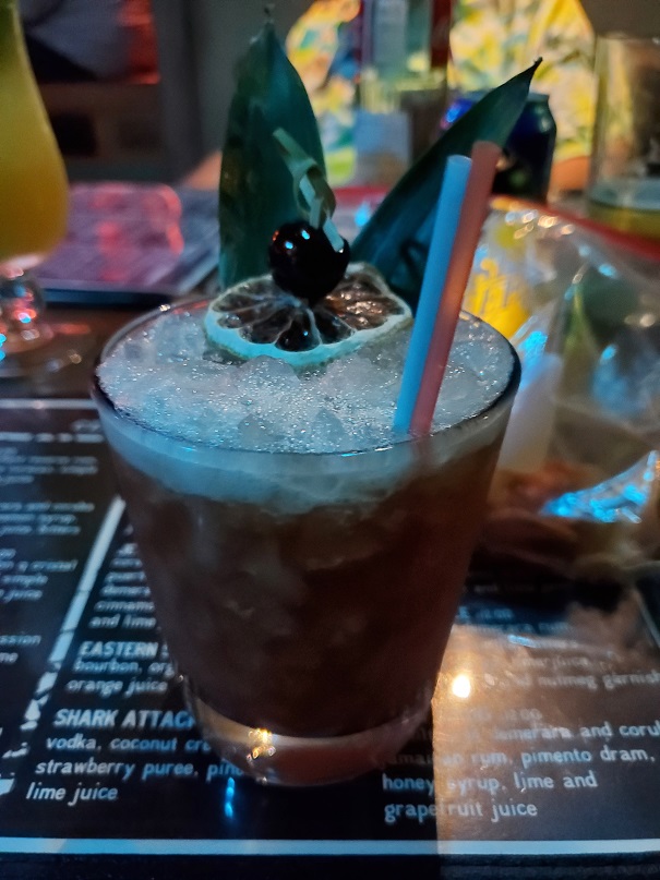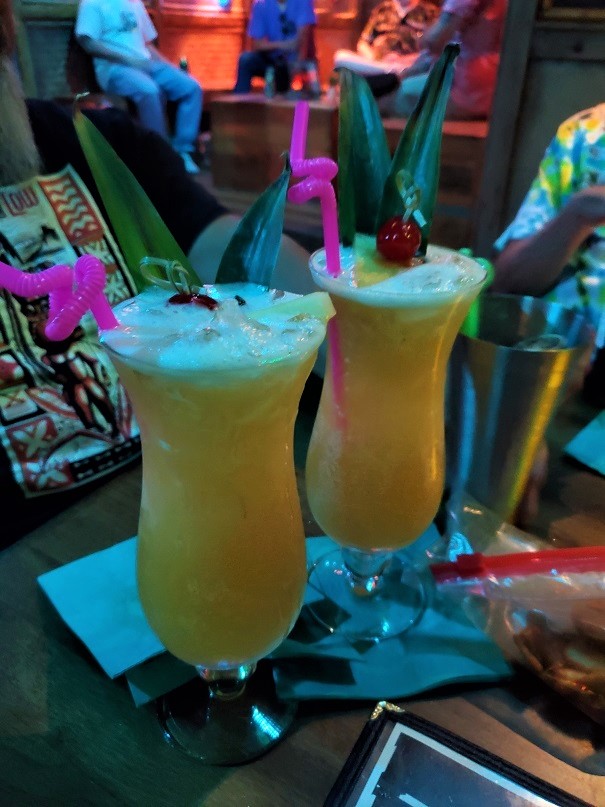 The afternoon was fun. I had planned on only staying for a brief two hours cruise on the Sinking Ship…but we ended up staying aboard for four. Shirley said she didn’t want our time together to end. So, John had another Beachbum Special. For me, I asked Benny to make me something different, whatever he chose. I told him I trusted his judgement implicitly. He delivered something called an Ankle Breaker. OMG. Yum.