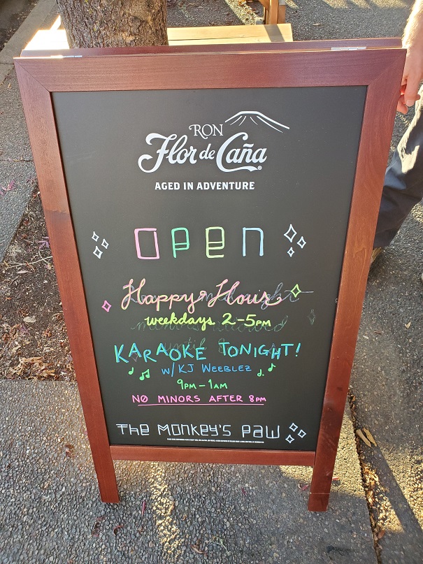 When Google Maps had us pull off of the freeway, we found ourselves on a nice, tree-lined avenue heading for a cute Main Street. It was early still and The Monkey’s Paw hadn’t been open long. Lucky us. We found parking right in front.