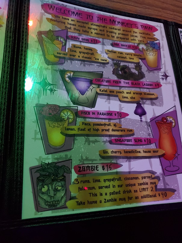 The third batch of drinks arrived. Erich had his El Diablo again and I had gone for a Zombie. Erich was ecstatic over his cocktail and was already planning to try and emulate it when he got back home. I enjoyed my fruity, boozy, very spirited Zombie as well. (A very appropriate drink for this place, especially if you are familiar with the Monkey’s Paw story the bar takes its name from…)