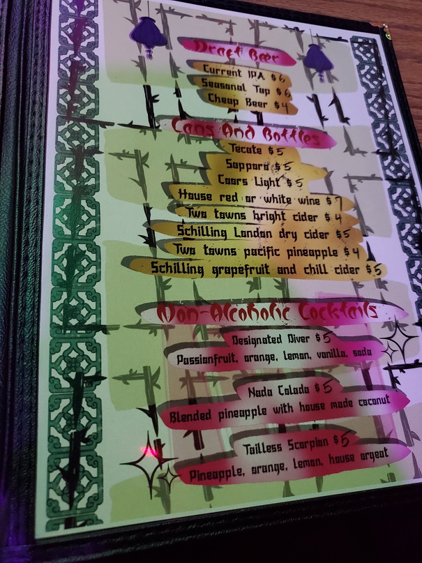 I was pretty impressed by the sheer number of cocktails available. There was a page of food items (which we didn’t try as we were planning on going to dinner directly following our tiki stop). There was also a page filled with beers. Hmm. Seeing it made me question the place again… How was this place going to be?