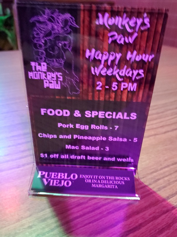 It was time to go. The Monkey’s Paw had proven to be far nicer than I imagined. It’s a simple place, but you can tell it really has heart and they’ve really tried to make it the best they could. From great drinks at affordable prices, creative mugs, and very friendly service, what is not to like? I was pleasantly surprised at how much I really enjoyed it and was glad we went out of our way so we could check it out. Here’s hoping that Scott, Teren, their other business partner(s) — and The Monkey’s Paw itself — are a huge success.