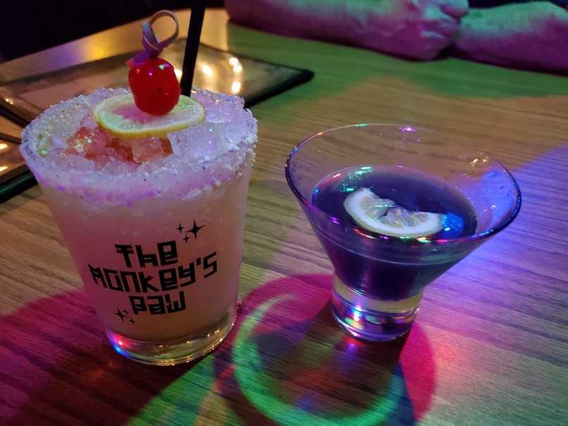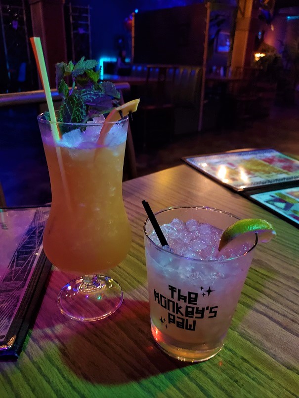 I hurried back to the table when I saw the waiter carrying over our drinks. To drink, I had picked the bar’s namesake concoction, The Monkey’s Paw. Erich had a Creature From the Black Lagoon (which was yummy. He let me taste it.)