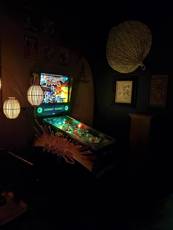 The waiter returned and took our order. Once he was done, tiki tourist that I am, I got up to give the place a once over. The first thing I noticed was a pinball machine. Hmm. That dive bar feeling hit again. I had a feeling the place was going to turn out to be awful and Erich would never let me hear the end of it. But if the place had to have a pinball machine, Attack From Mars? It looked pretty cool.