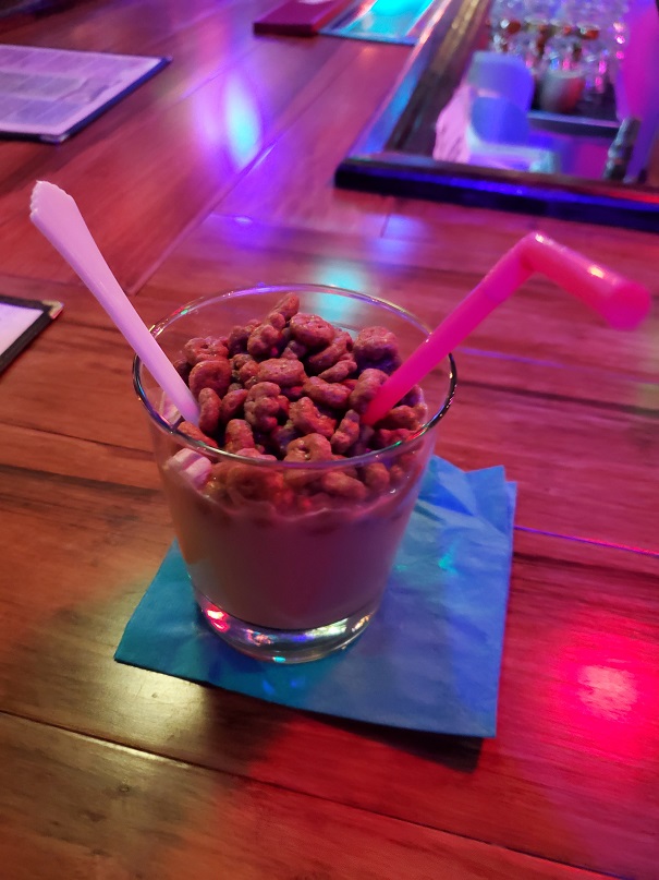 Zowie! It came with a straw and a spoon, to get all of that drunken Count Chocula goodness. Ha! How bizarrely fun it was. It was like being a kid having cereal in the morning–but with a kick!