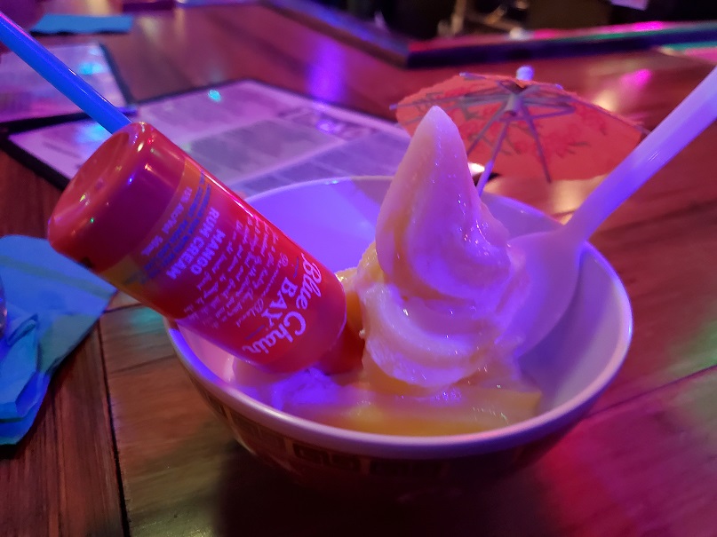 A “used” Dole Whip cocktail? I’ll take it. I was gonna order one anyway…and this one was free. And what an interesting monstrosity it was. Unfortunately I didn’t realize I needed to unleash the mango cream rum from where it collided with the Dole Whip until the Whip was already pretty much whapped and gone.