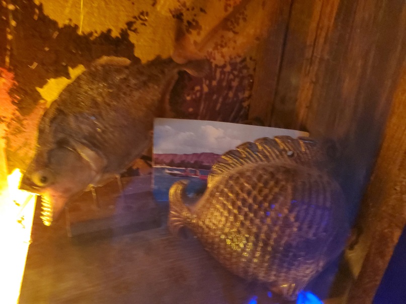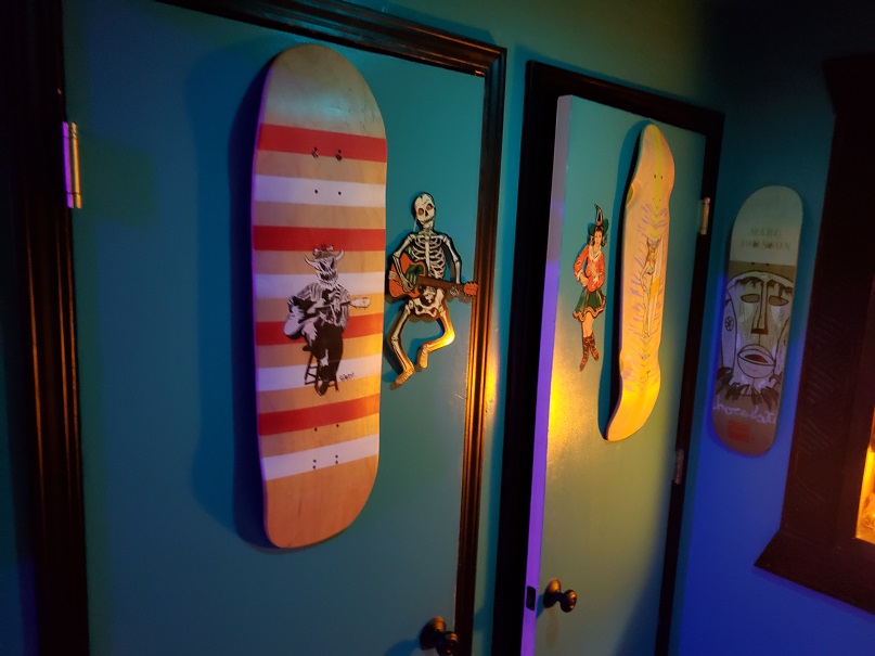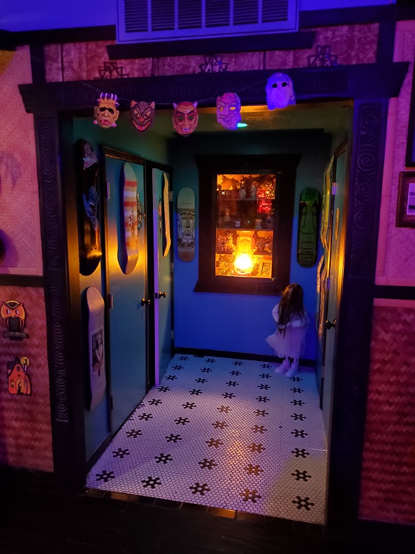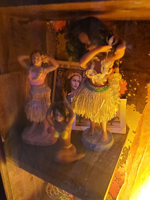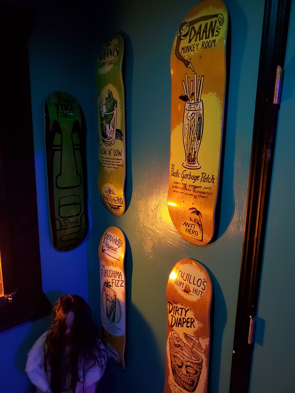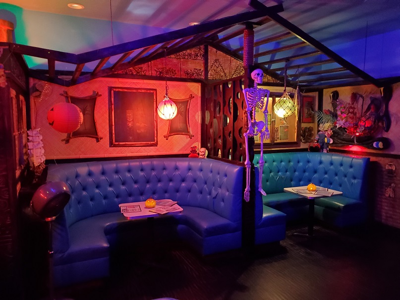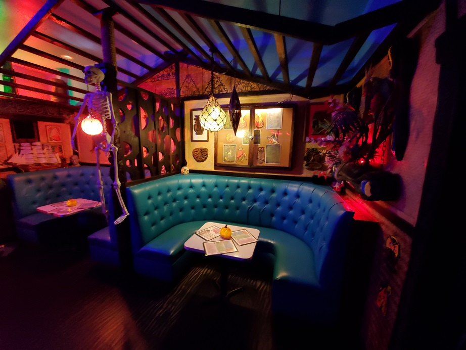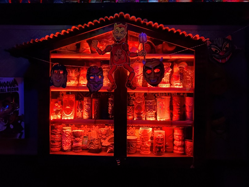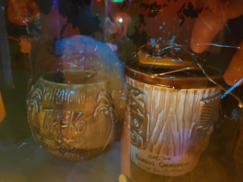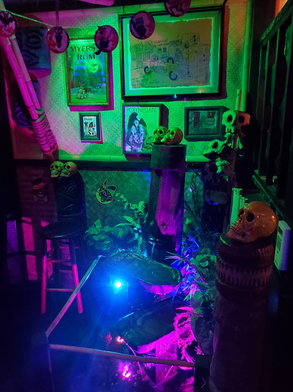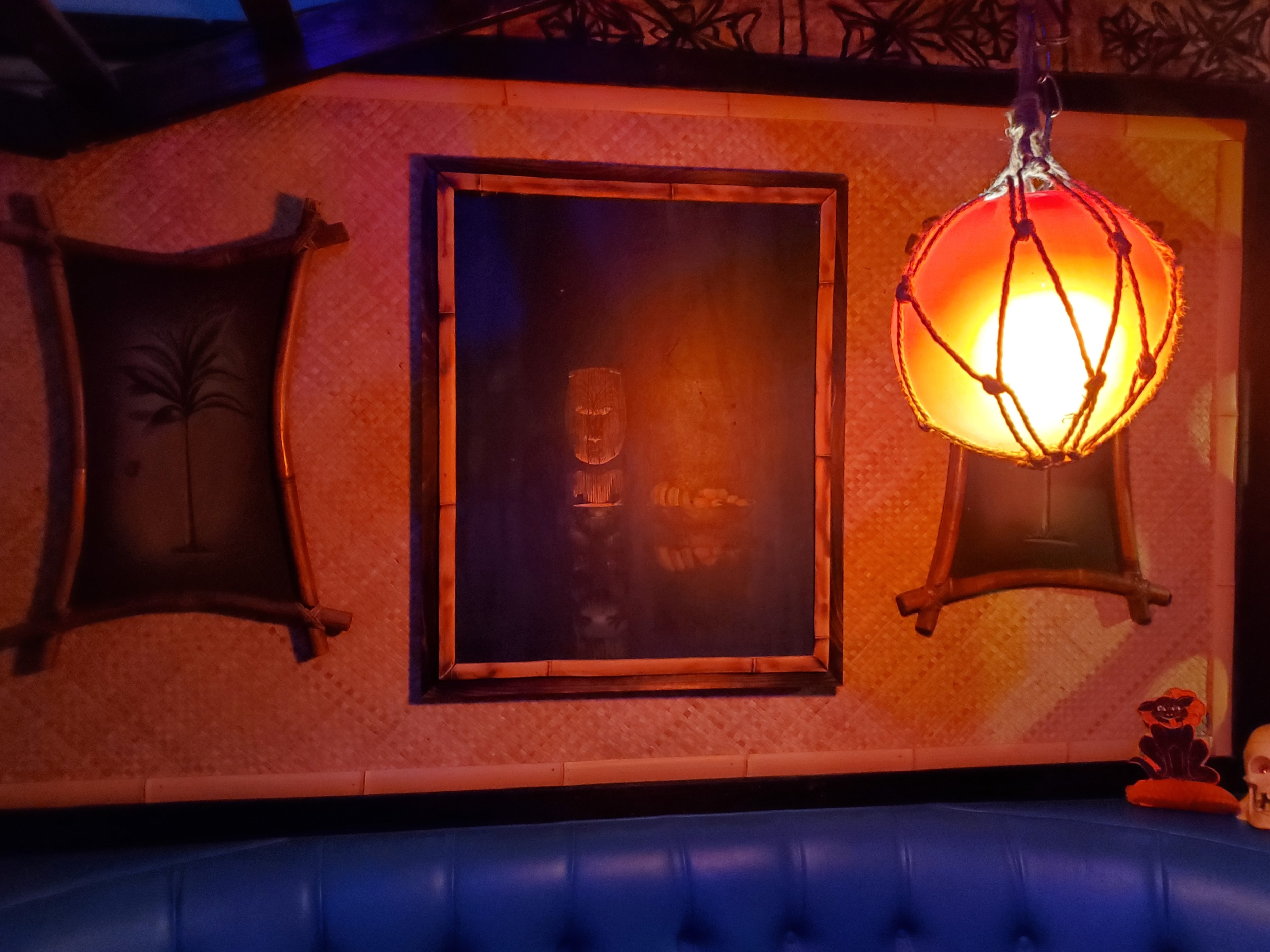 At one point, I needed to visit the Enchanted Pee Pee Room. I checked out the display case and other decor in the alcove that leads to the bathroom. In addition to some mugs, hula girl figurines and a stuffed piranha, there was this cool glowing tiki. The whole thing had this weird, spooky, Halloween vibe to it.