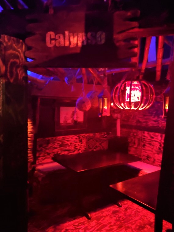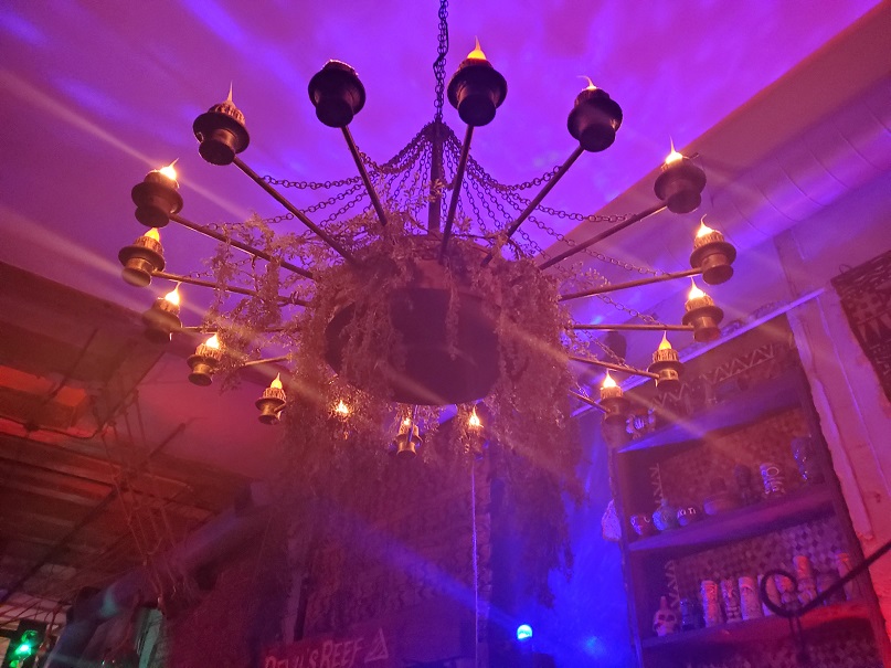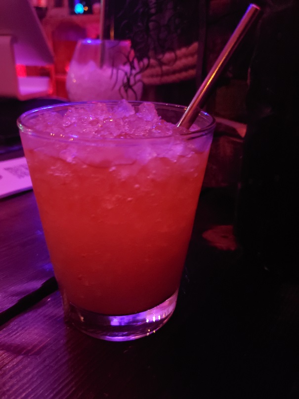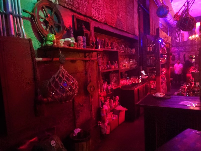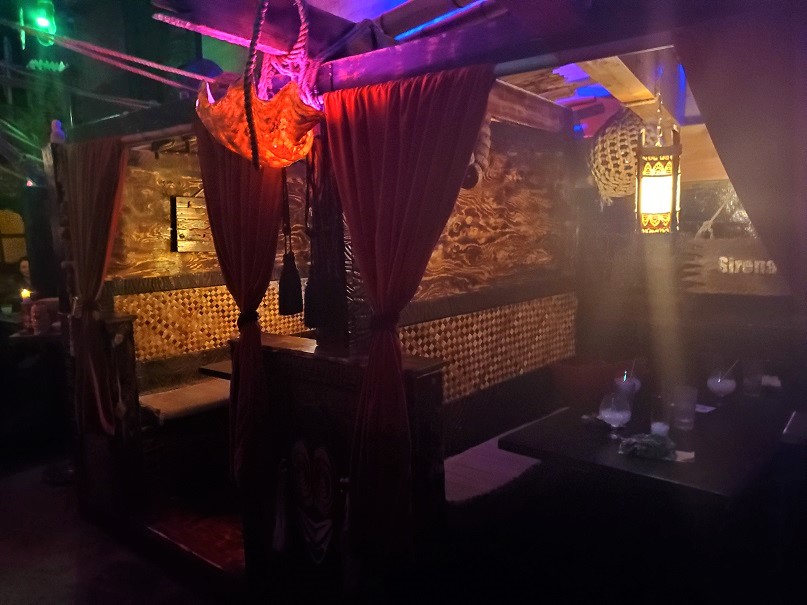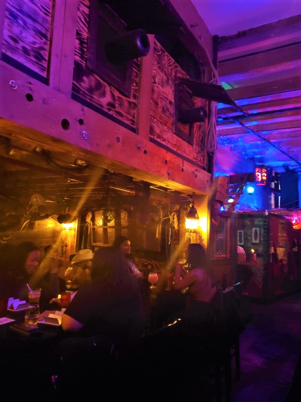 Devil’s Reef is a fascinating-looking bar. It has a nautical theme, but to me, it reminds me of Disney’s Pirates of the Caribbean. The seating areas, to me, almost suggests an old, Caribbean port town (but somehow darker and more sinister), complete with protective cannons protruding from the town walls. There are also nods to legendary horror author H. P. Lovecraft throughout. (The name of the bar as well as those of the drinks are all inspired by his work.) It is pretty impressive.