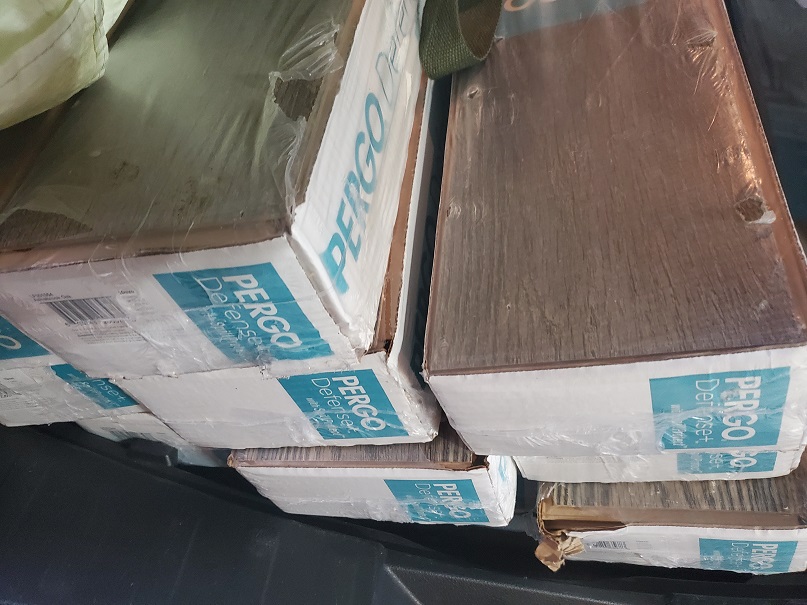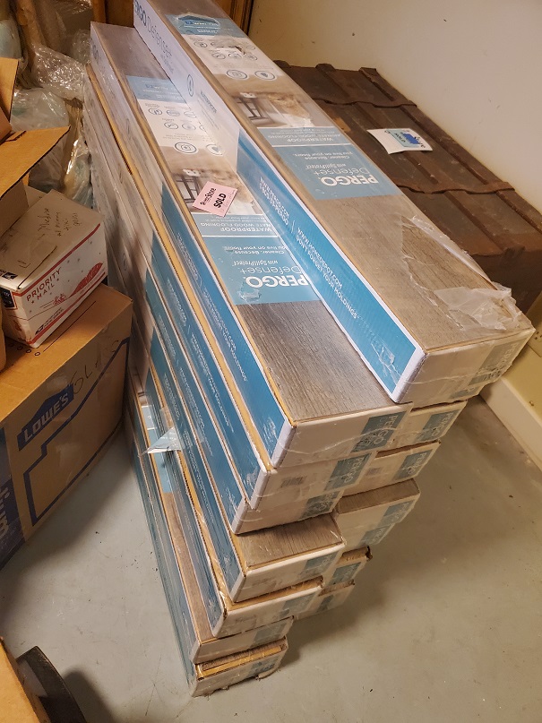 One of Erich’s suggestions was having some wainscotting around the perimeter of the bar, with a strip of halved bamboo separating the top half of the wall from the bottom. This got me to thinking of Habitat for Humanity again. I had noticed some old wood-looking laminate there. On a trip back, I found they did carry it…for $74.99 a case (which was about 6-8 strips). Yikes! That would cost a small fortune. But then I noticed a small pile of laminate that had been donated at only $15 a pack. There were only 15 packs, which would be enough for the wainscotting–plus a little extra “just in case.” SOLD!