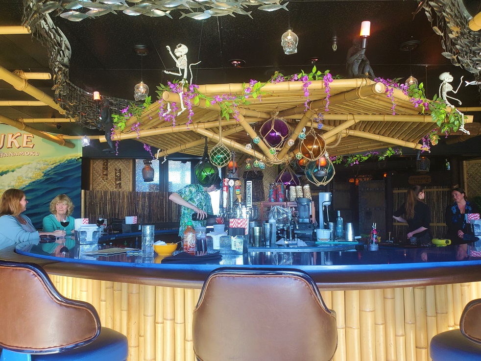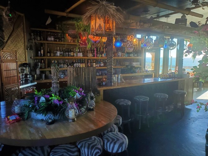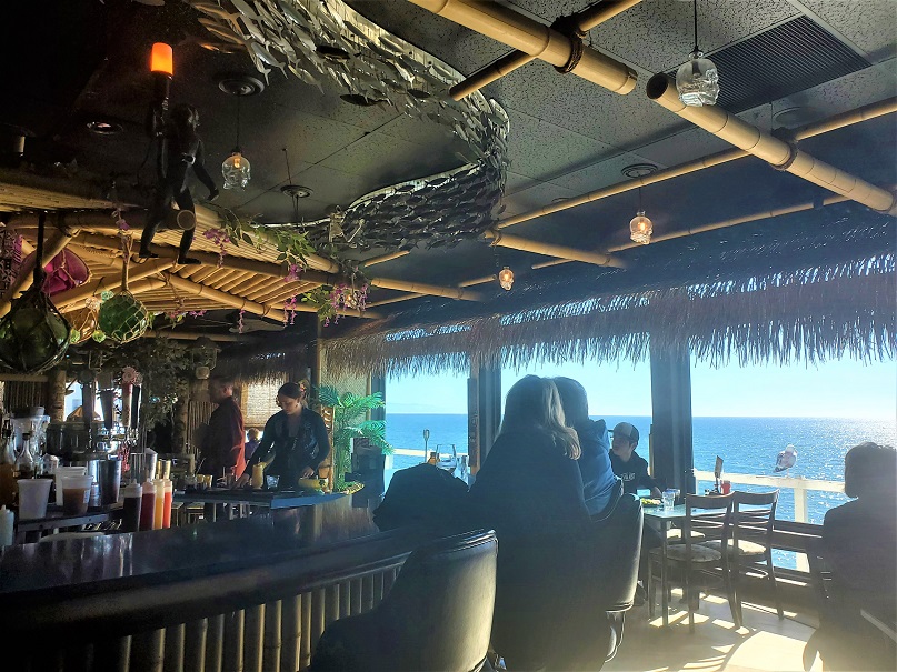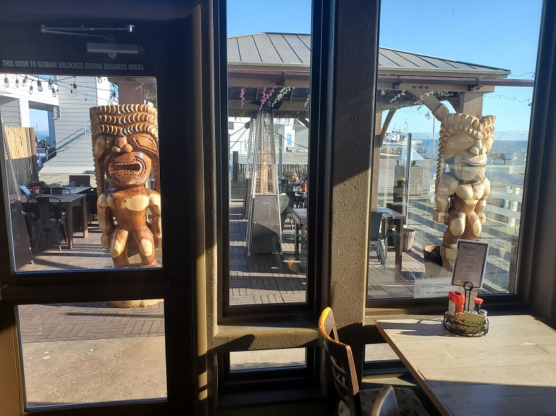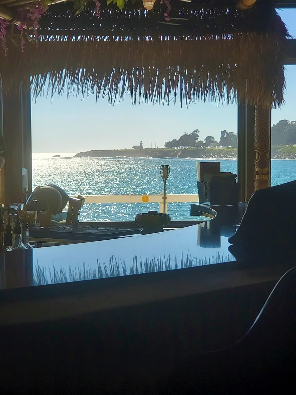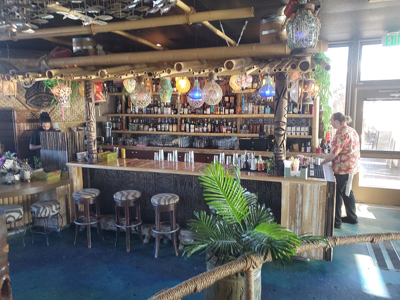 Eventually, the fries disappeared and our glasses were mysteriously empty again. It looked as though our time in this spinning paradise was coming to a close. There was a lot to like about this place–the food, drinks, mugs, decor, view, even the music (not exotica, not surf, but traditional Hawaiian) was on point. I hadn’t even really gotten to explore the place. Perhaps we could go and sit at the bar in front and have one more little drink? Since moving to Washington, who knew if I’d ever be back in Santa Cruz again or not. We had to make the most of our time there.
