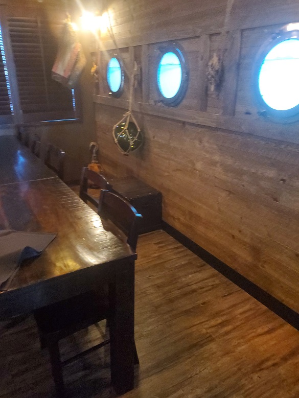 And what was that I spied? The Captain’s Table? It looked like a private V.I.P. room. As we swung closer to it, I got up and checked it out. There were portholes on either side with “ocean views” (i.e. televisions screens showing video of the sea). No V.I.P.s were there at the moment. But it did look like the employees were making use of it as a break room. Good for them.
