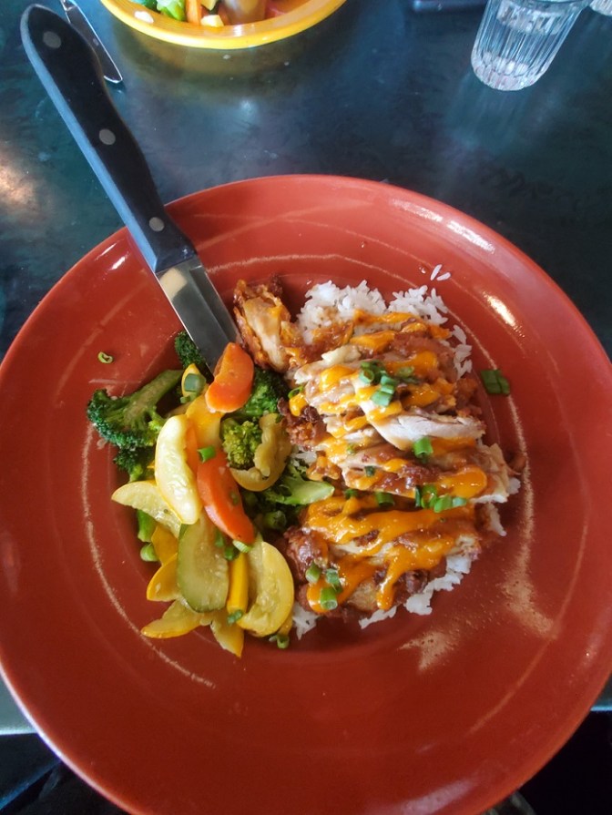 For lunch, Erich chose the Pineapple Beurre Blanc Mahi Mahi, which came with housemade mashed potatoes and grilled vegetables. I went with the Hawaiin Mochiko Fried Chicken, which was a chicken thigh that was fried in a mochiko rice flour marinade. It came served over rice with a gojuchang aioli and miso sauce. I also ordered some mixed veggies.
