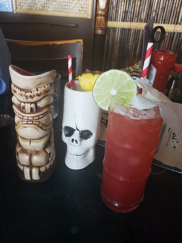 Incredibly, our cocktails seemed to have vanished into thin air. How could that be? We just had to order more. I had a Walking Dead, a blend of rums, passion fruit syrup, triple sec, and pineapple, lemon and lime juices. Erich had a Dragon’s Bite, a potion made with Luna Sea Vodka (a locally made brand), dragon fruit ginger syrup, lemon juice, soda water, and muddled mixed berries. It looked refreshing. Since the Mr. Makai mug was no longer available and I already had the generic skull mug, I still wanted something from the bar. Although they had a couple of signature mugs, I went with the one on the left below.