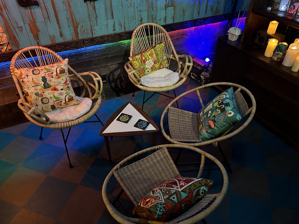 There is an intimate seating area with cheery, tiki-themed pillows on the chairs and the coolest little triangular table.