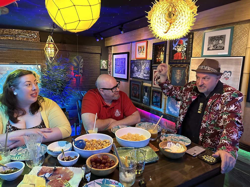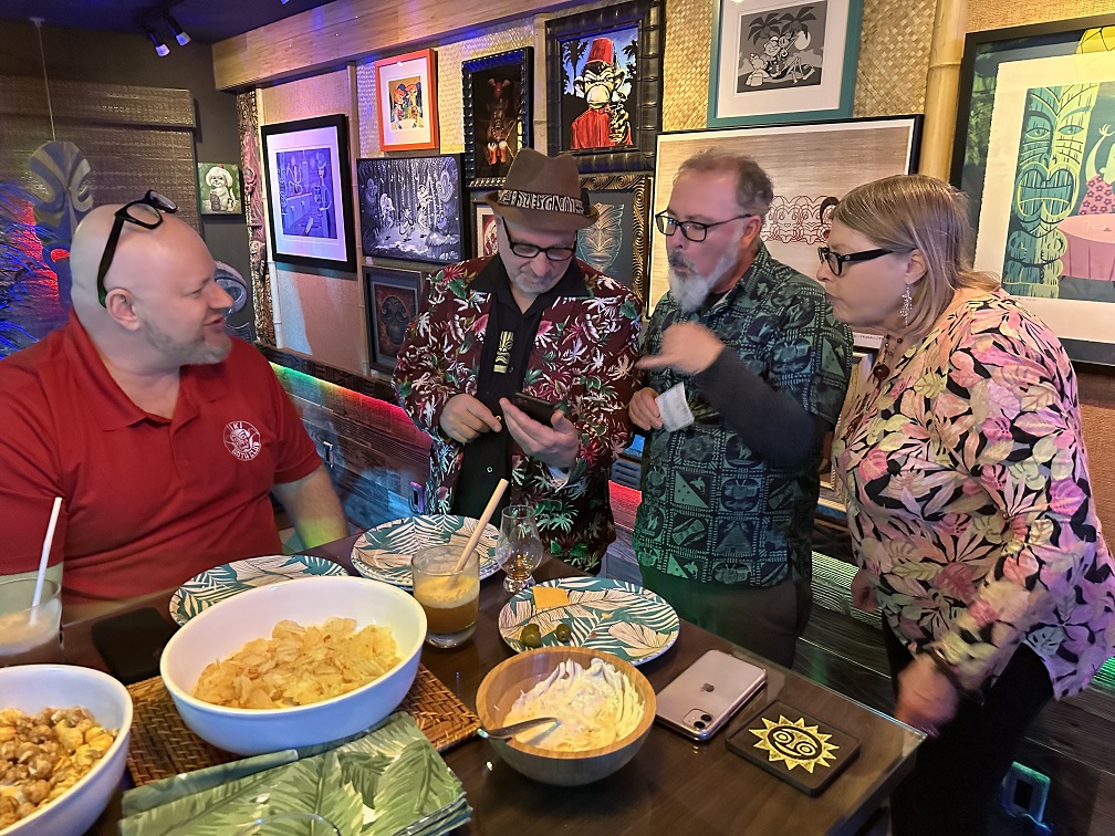 We munched, drank, and chatted. (Well, I mostly listened. Even though I felt welcome, everyone else knew each other already. I was the newcomer.) There was discussion about Stephen’s trip to the Sepik region of Papua New Guinea, Geneen and Kevin’s New Orleans rum adventure, the upcoming 20th (and allegedly final) Tiki Kon in Portland this summer. Ray was also mentioning the live taping of his “Tiki With Ray” show coming up at the Devil’s Reef in Tacoma.
