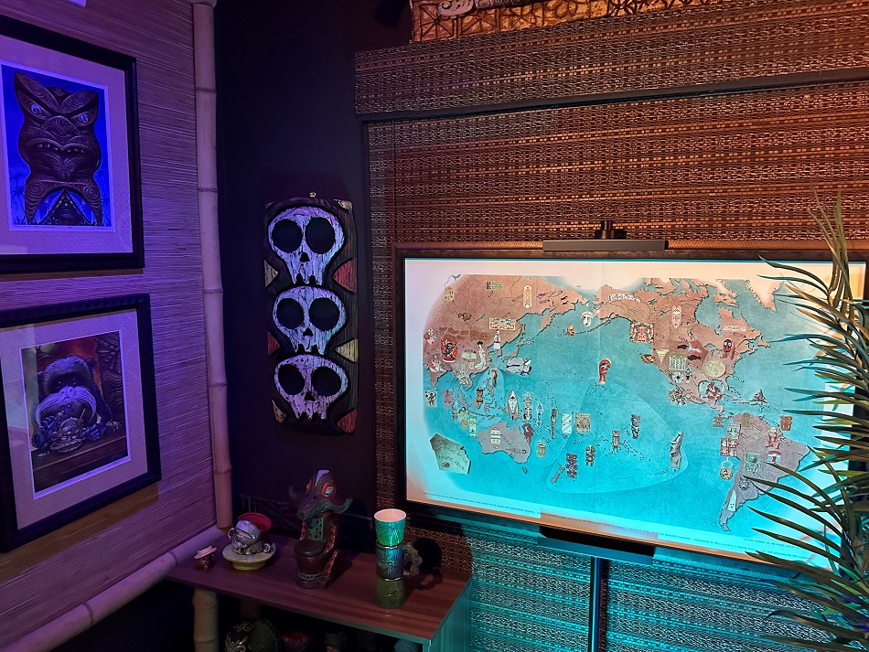 Stephen had told me that he and Heidi had a home renovation going on in 2018. The actual bar was already there and open to a den. Stephen worked with contractors to create the bar, but it had been Heidi’s wise idea to enclose it so it could become its own magical space. The results are pretty darn cool. I can only hope my home tiki space — if it ever happens — is half as nice. I decided to give the front half a good looking over…