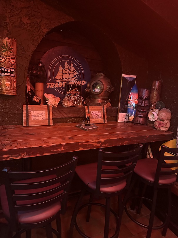 Having owned the restaurant since 2014, the transformation from what it was to what it is now happened due to covid. Because the governor was going to allow inside dining again for restaurants that had booths with partitions, that prompted Steve to buy booth seating at an auction. Separating the booths with a hut-like walls followed. Decking the booths out to make them individual (Da) Tiki Huts came naturally. The whole interior is all of their own making, and you can tell the place is a real labor of love.