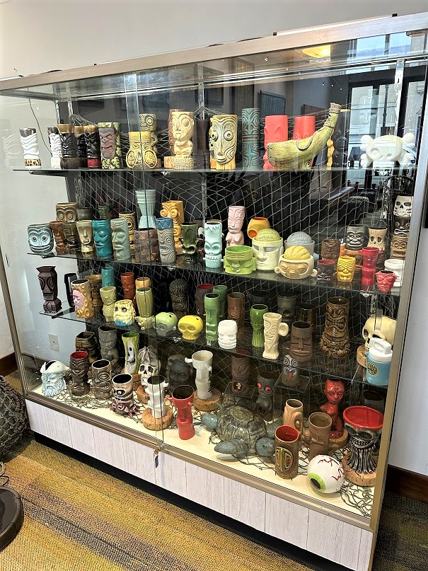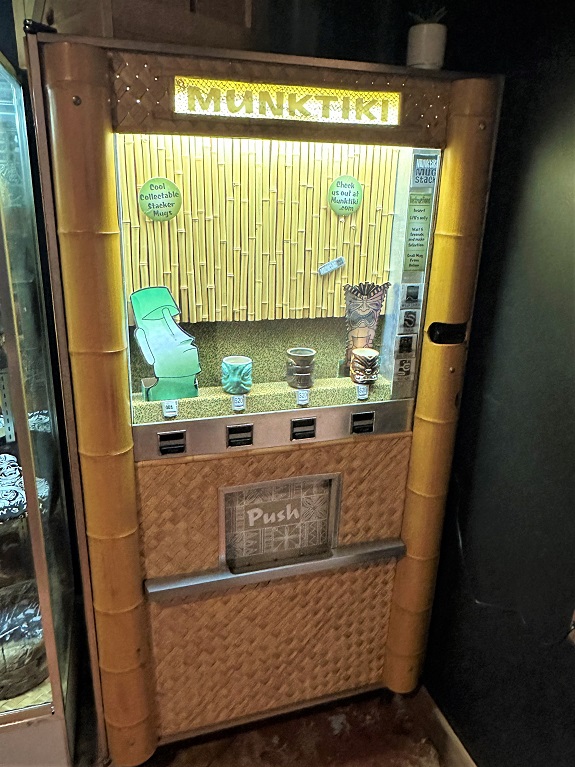 At some point, I needed to use the bathroom. As I headed to the back, I noted the display case of Munktiki mugs for sale as well as the famous Muntiki tiki mug vending machine! For twenty bucks a pop, you could get a small tiki mug from the machine. I tried to get one using my ATM card, but it wouldn’t take it. It is strictly cash only ($20 bills) and I had none on me. Drat!