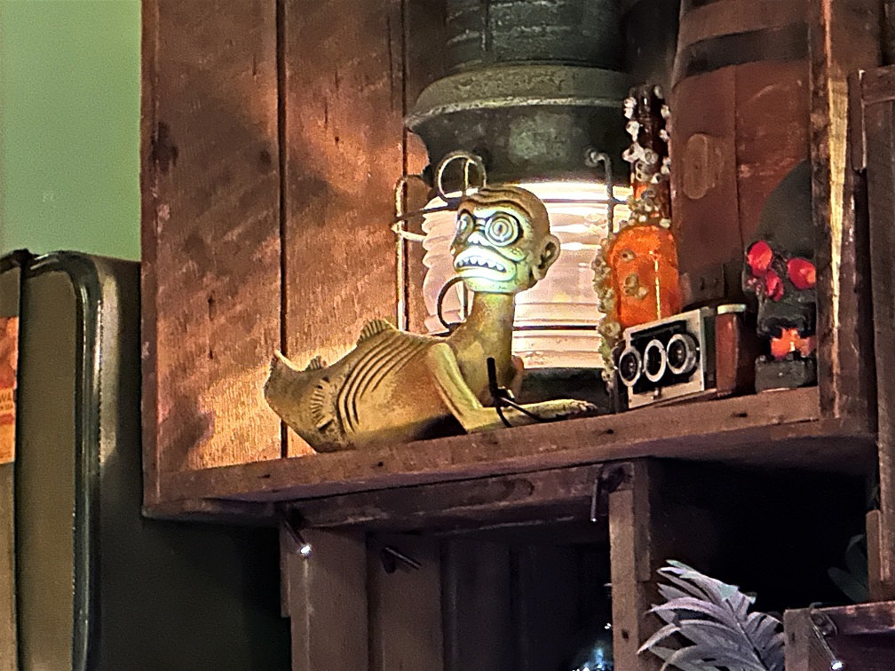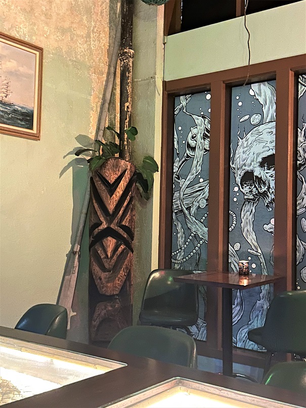 As I sat and sipped, I got a good look at the place. There were so many interesting aspects to the place tucked here and there. The back wall resembled a ship’s haul, with nautically themed pictures hanging from it. There was a fascinating tableau done up over the door. In addition to various bottles of booze, the bar wall had many curiosities hidden about here and there. It wasn’t over the top, but it didn’t need to be. It was a clean, modern tiki bar that paid respect to those bars that came before it. It is classy, yet not alienating at all for classic tiki aficionados.