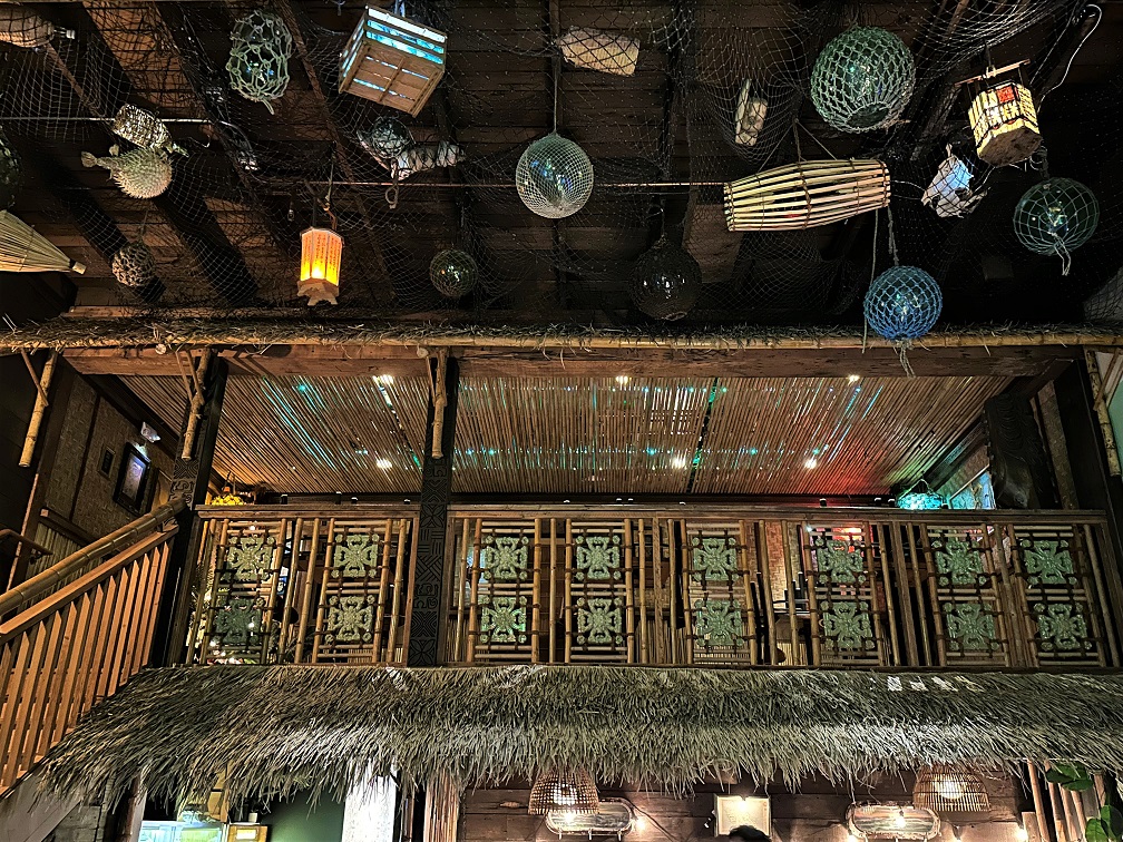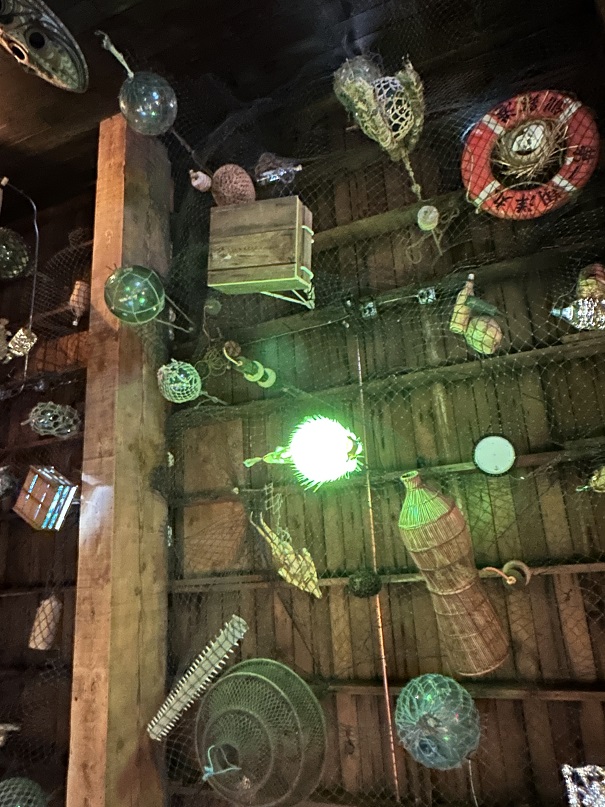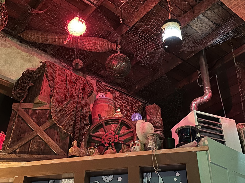I especially liked the ceiling. Having such a high ceiling, it might have been easy to just forgo any sort of treatment. (How many people are going to bother looking up?) But they had done a good job with it. In addition to some cool tiki lights, there were the de rigueur glass floats, puffer fish, fish tramps, and netting, among other items.