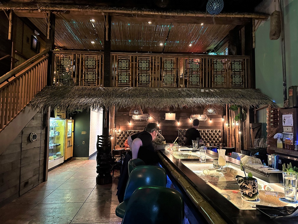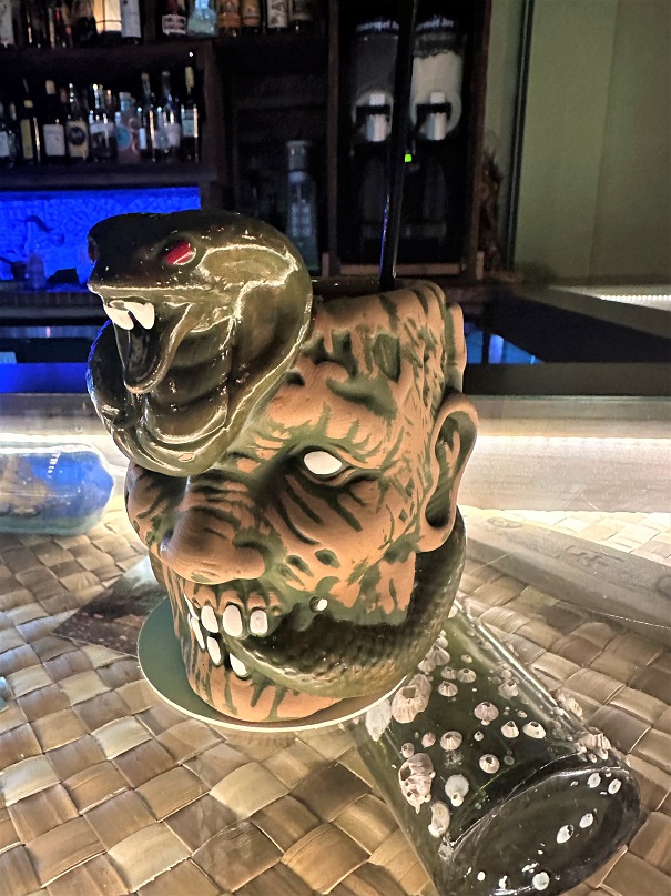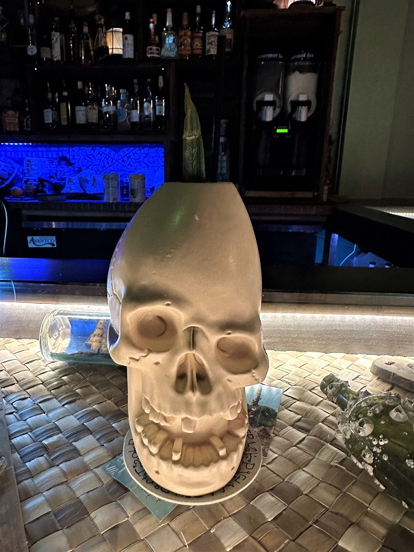 So this, at last, was Dead Man’s Isle. Very nice. Very nice, indeed. The place was cavernously tall, but not as deep as I expected. I found myself a place at the bar, admiring the glass top with the tiki artifacts on display beneath it. The high ceiling allowed for a most impressive bar wall.