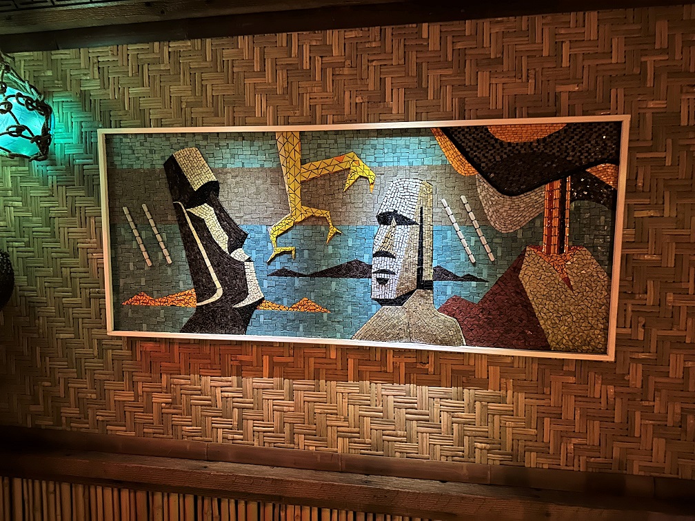 As I was concluding my time there and Deb was ringing me up (Yes, I bought something. Hello?), she suggested I might like to visit her son’s tiki bar next door. Of course I would. I’d be delighted. (It was my plan all along.) Deb told me that I should look for the tiki mosaic on the bar’s second floor. She had restored it herself.