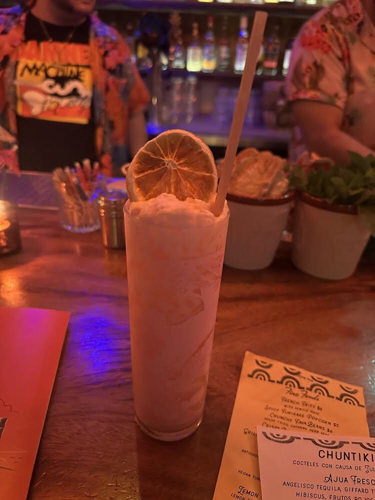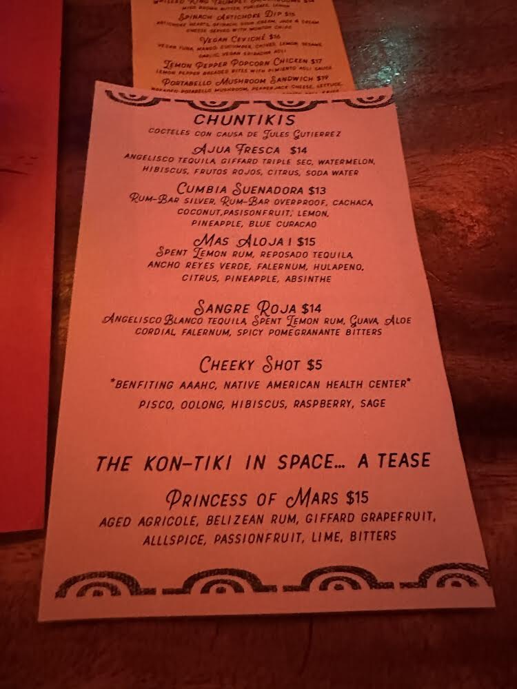 The clock was ticking. I’d wanted to be back on BART by 8pm, before it got dark. It was my personal “last call.” From Mr. Gutierrez’s list, I chose a Cumbia Suenadora, a creation born of rums, cachaca, coconut, passion fruit, pineapple, lemon, and blue Curaçao. At the same time, I ordered a $5 Cheeky Shot. One hundred percent of the price of the shot (made of pisco, oolong, hibiscus, raspberry, and sage) benefitted the AAAHC, Native American Health Center.