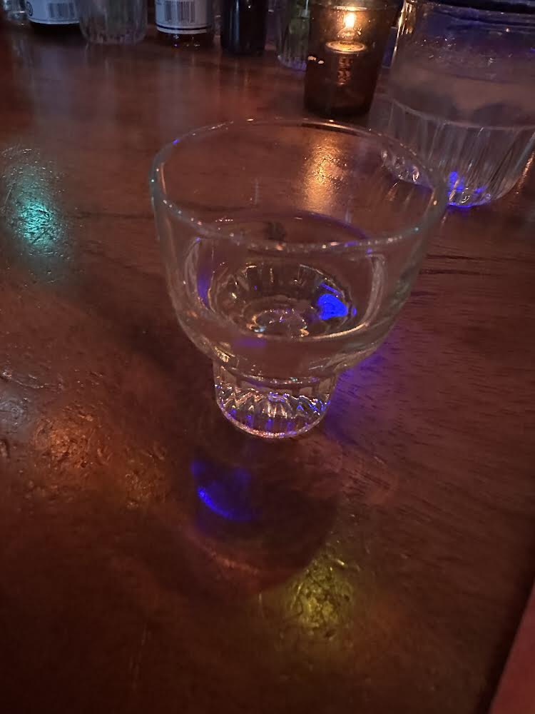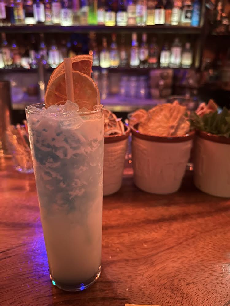 I went over and paid for the drink, an Ola Negra (Black Wave). I was handed a swizzle stick with a star on the end. (That was my “drink ticket.”) The drink consists of black sesame-washed Cachaca, blue Curaçao, and the Secret Milk Punch (a clarified tropical milk punch). Wow!