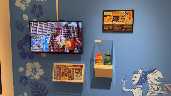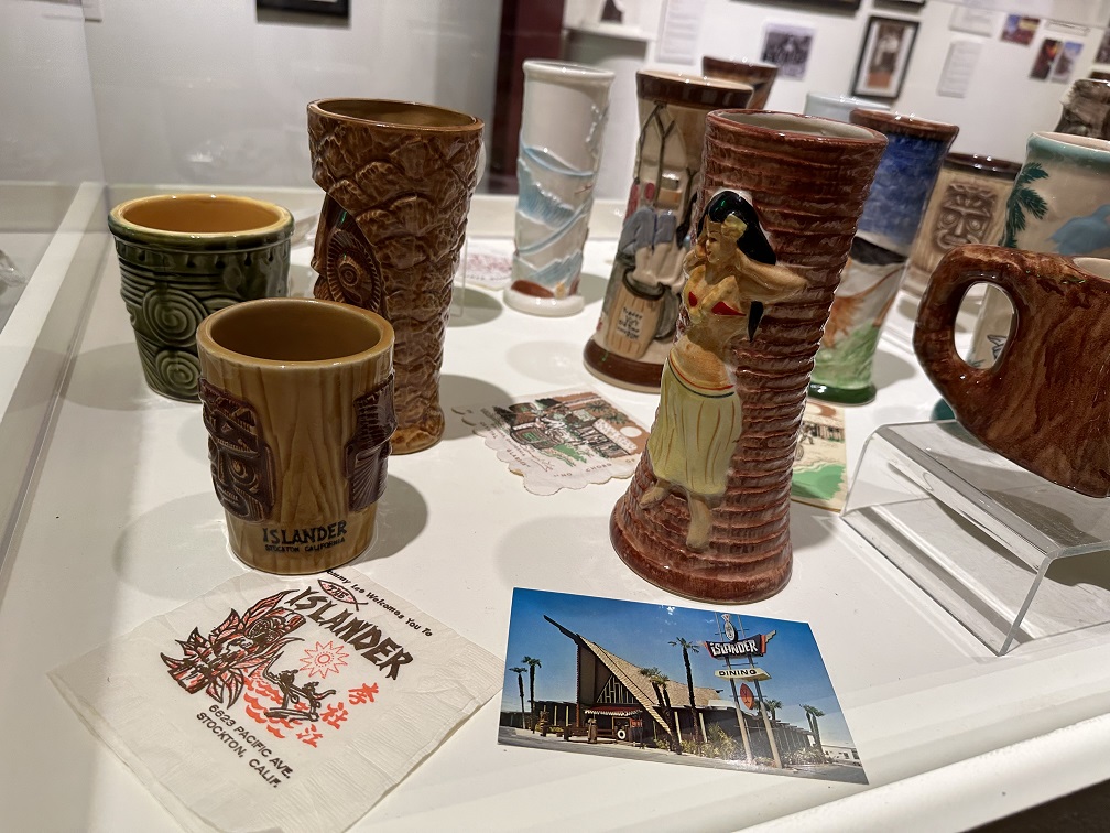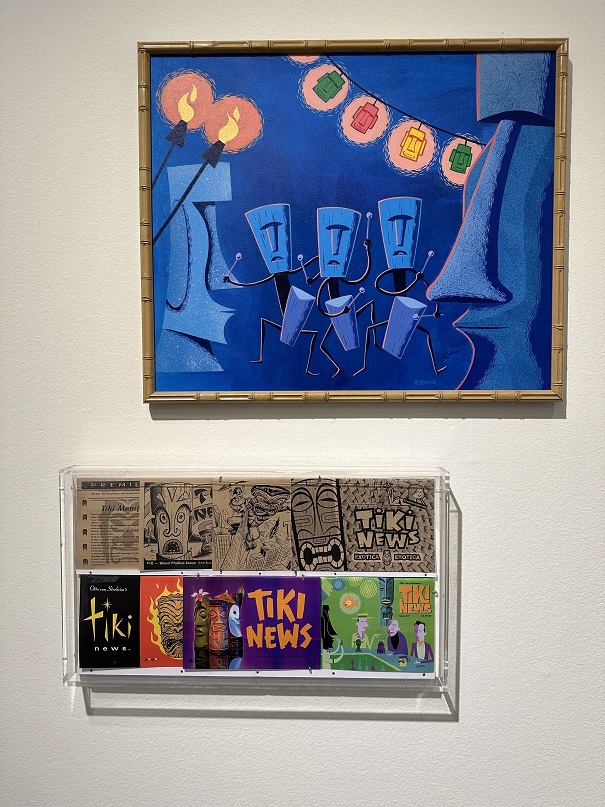 The final section of the exhibit is a look at tiki today. There is a small display of Otto von Stroheim’s TIKI NEWS zine (which may have been very instrumental in keeping tiki from slipping into total obscurity) on up to flyers for the annual Tiki Oasis event he and Baby Doe started in Palm Springs (before moving to its permanent home in San Diego). A collection of mugs and art from modern tiki artists also rounds out this final section, giving hope of keeping the Tiki Dreams of many enthusiasts alive.