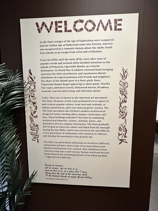 This past May, I was fortunate to be visiting California. Although I hadn’t arrived in time for the opening, I was going to have a chance to visit the museum not long after the exhibit debuted. I had contacted my new tiki pal, Gillian (whom I had met by chance when I visited Petaluma’s Kapu earlier in the year) and, along with my friend Erich, we made plans to go-go.