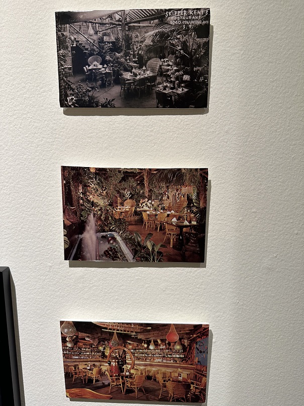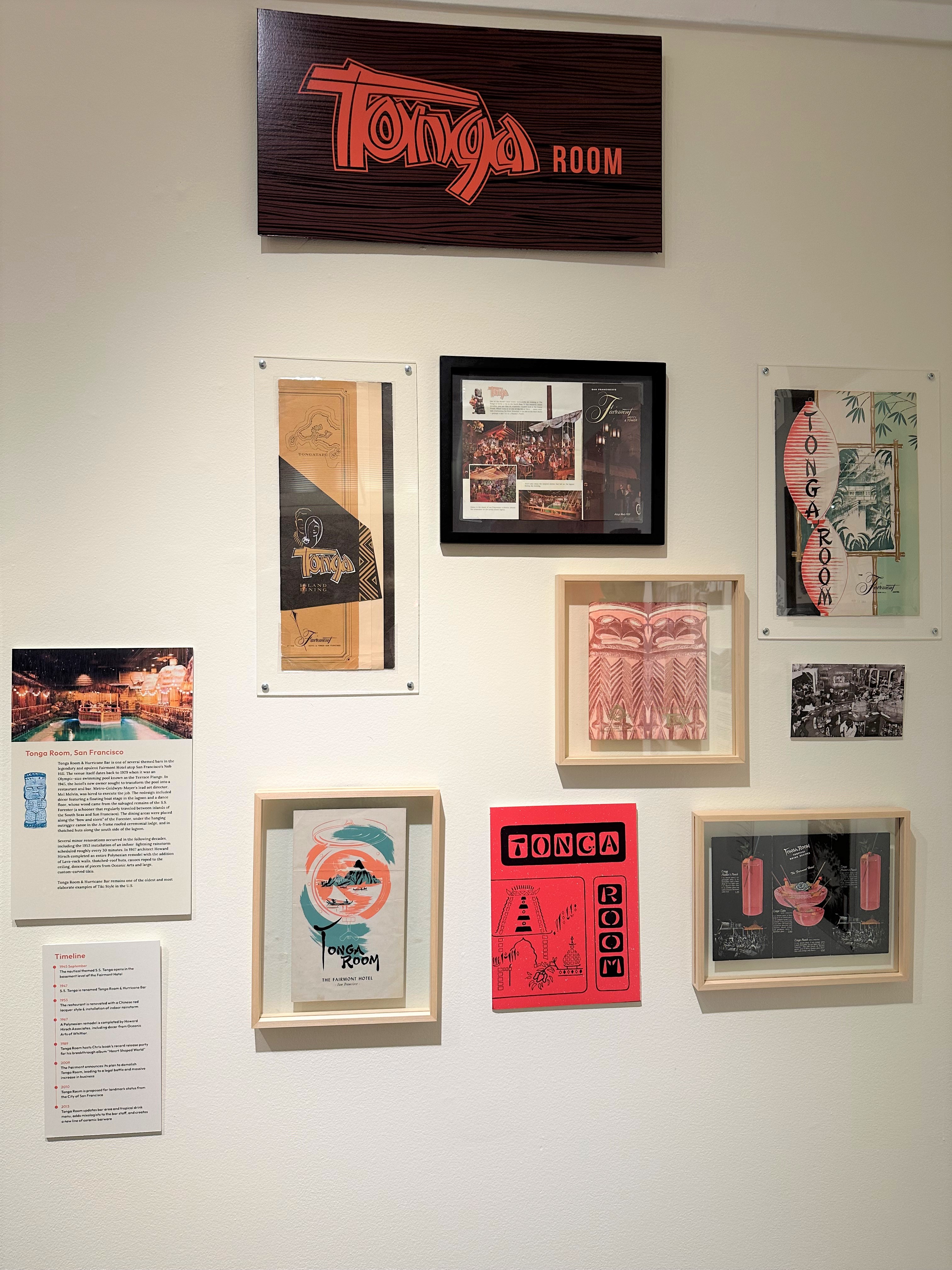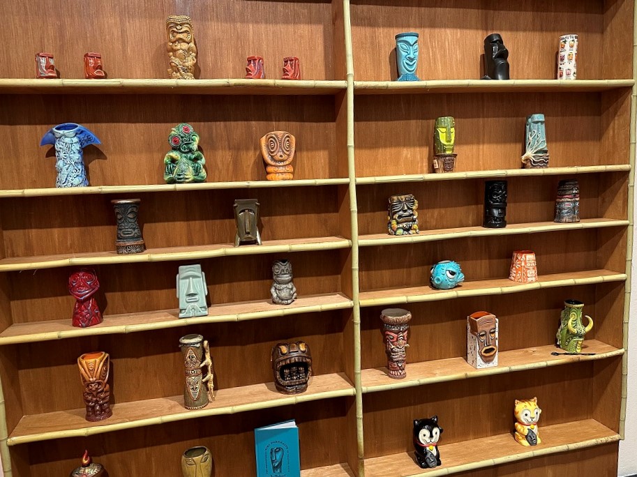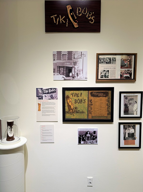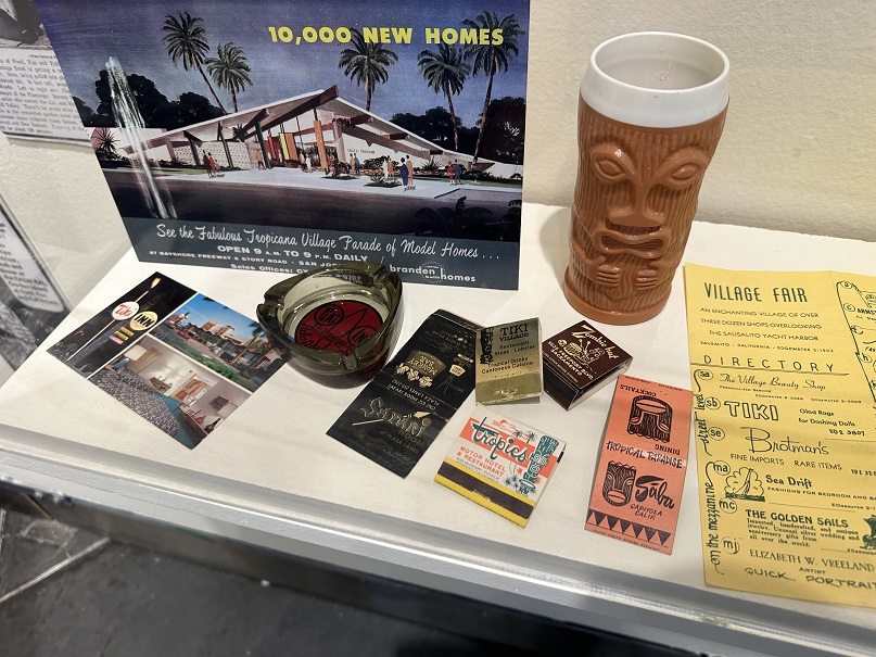 An old, neon Trader Vic’s sign with a flashing red arrow leads visitors on a voyage to the distant tiki past for a glimpse into the many tiki bars, restaurants, and palaces that dotted the Bay Area landscape during the initial tiki craze. There are matchbooks, dinnerware, menus, and photos of those wondrous, bygone establishments.